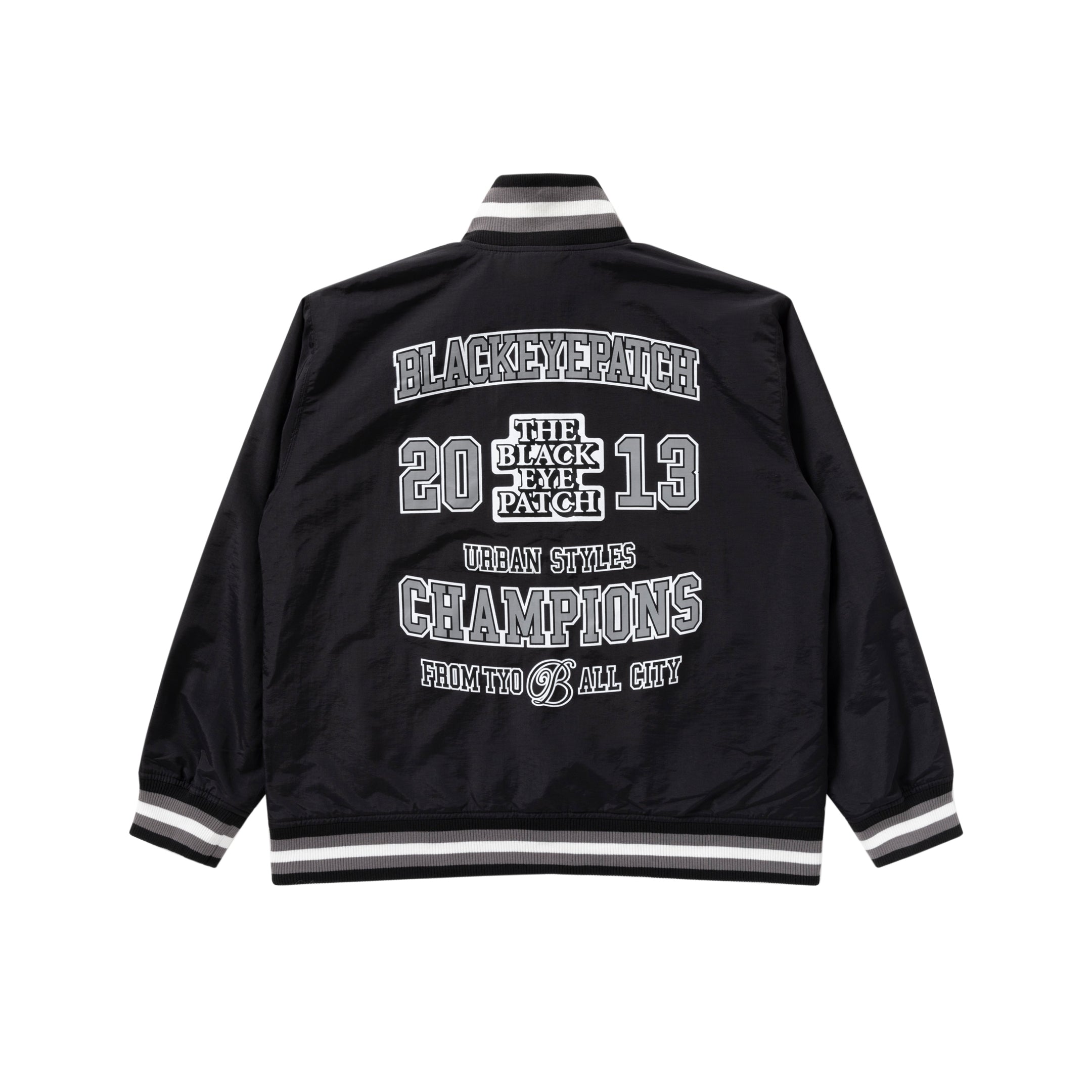 スポーツカルチャーからインスパイアされたカレッジ調のグラフィックがプリントされたナイロンジャケット。