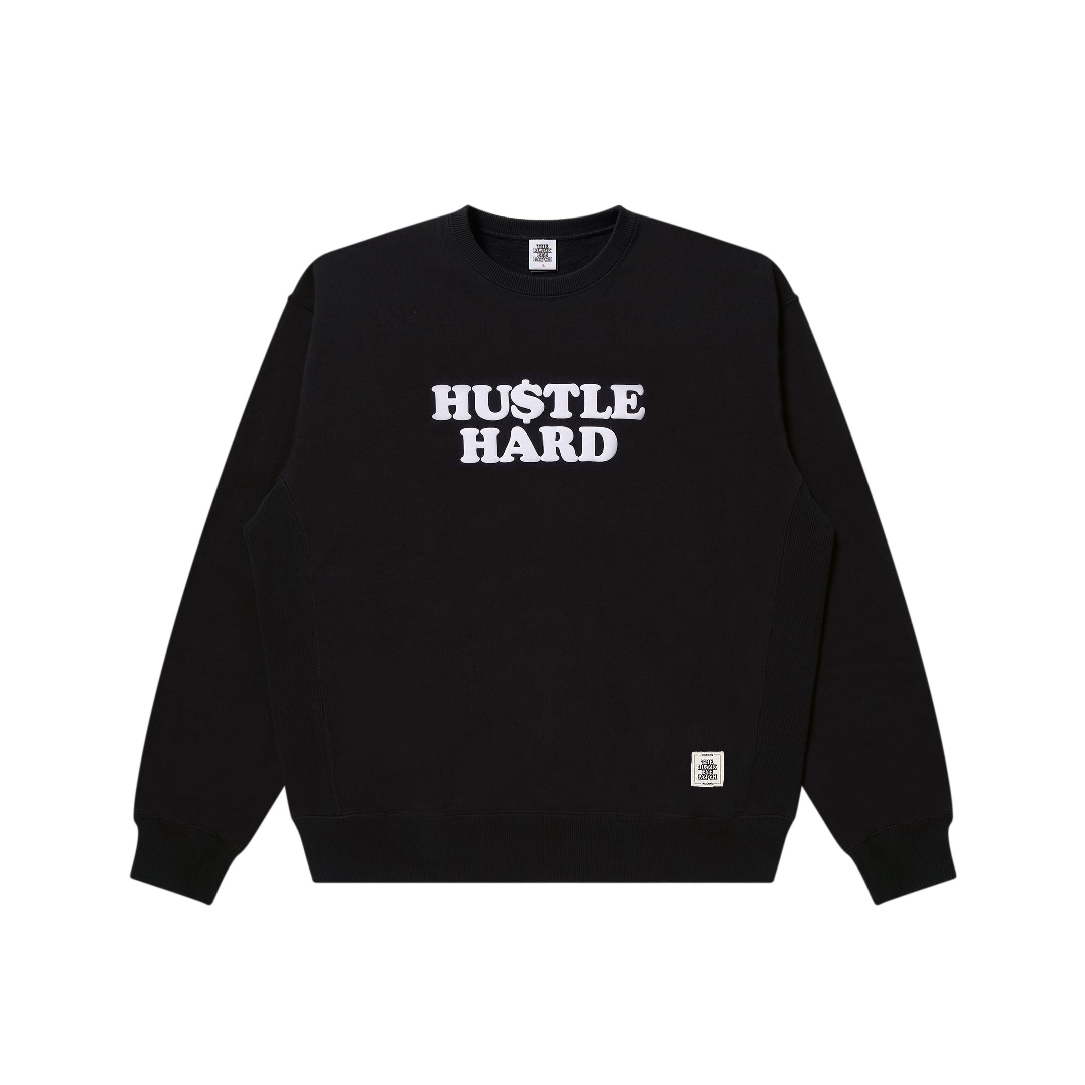 フロントに "HUSTLE HARD" のメッセージが、背中には同じフォントでブランド名がプリントされたクルーネックスウェット。