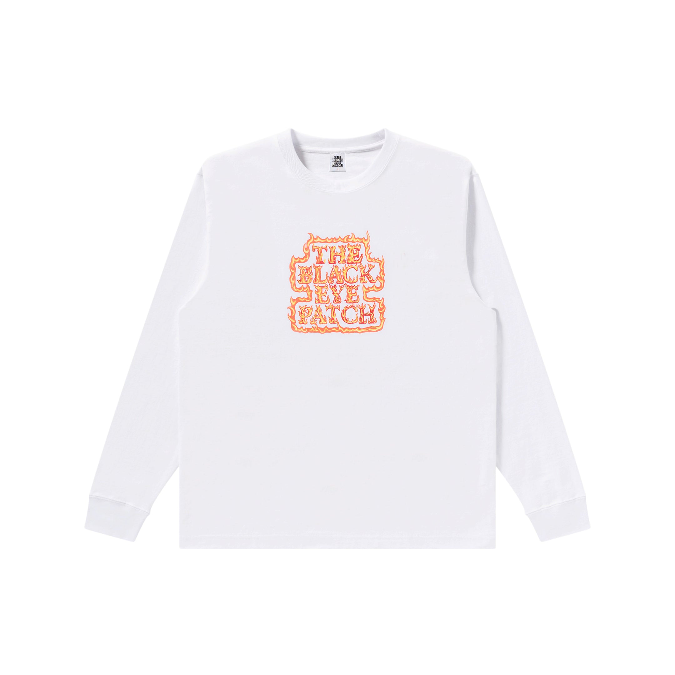 A 8.5oz long-sleeve t-shirt featuring a graphic print of the “OG LABEL” logo rendered in flames.