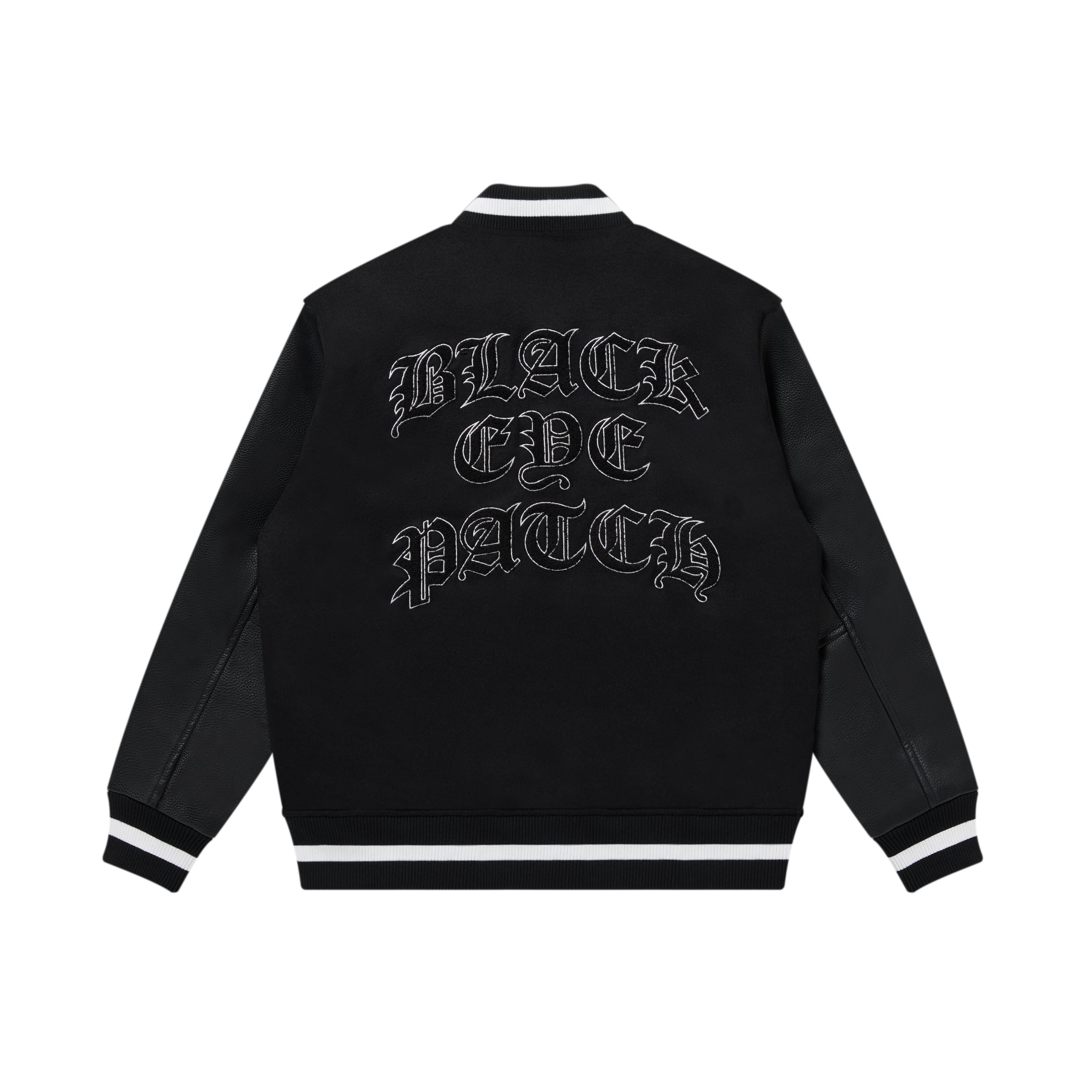 Versity jacket featuring a thick melton wool body combined with PU leather sleeves. A piece featuring appliqué embroidery with an “Old English” graphic. Available in two colors: black and red.