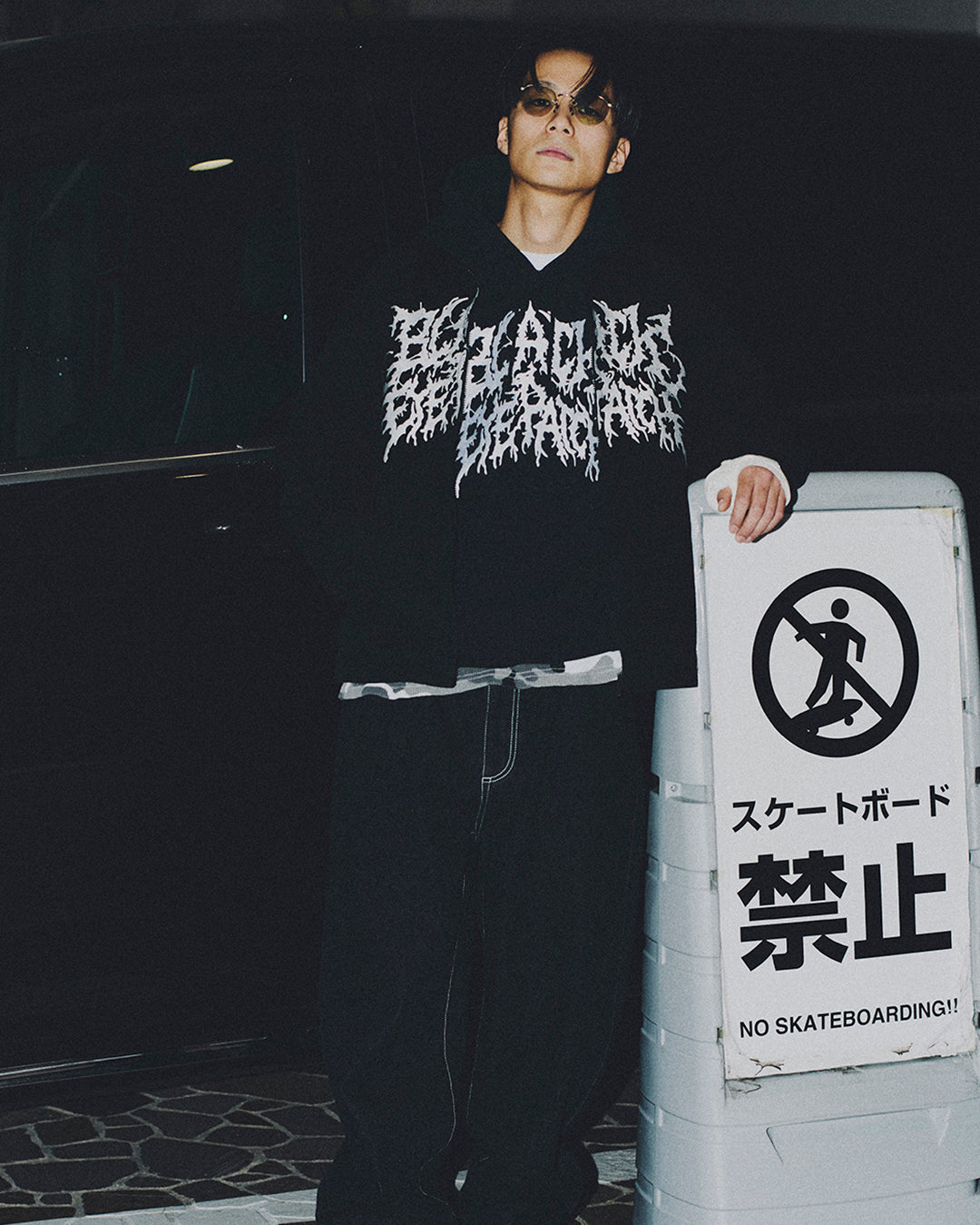 フロントにデスメタルバンド調のグラフィックの刺繍を施したダック地のワークジャケット。