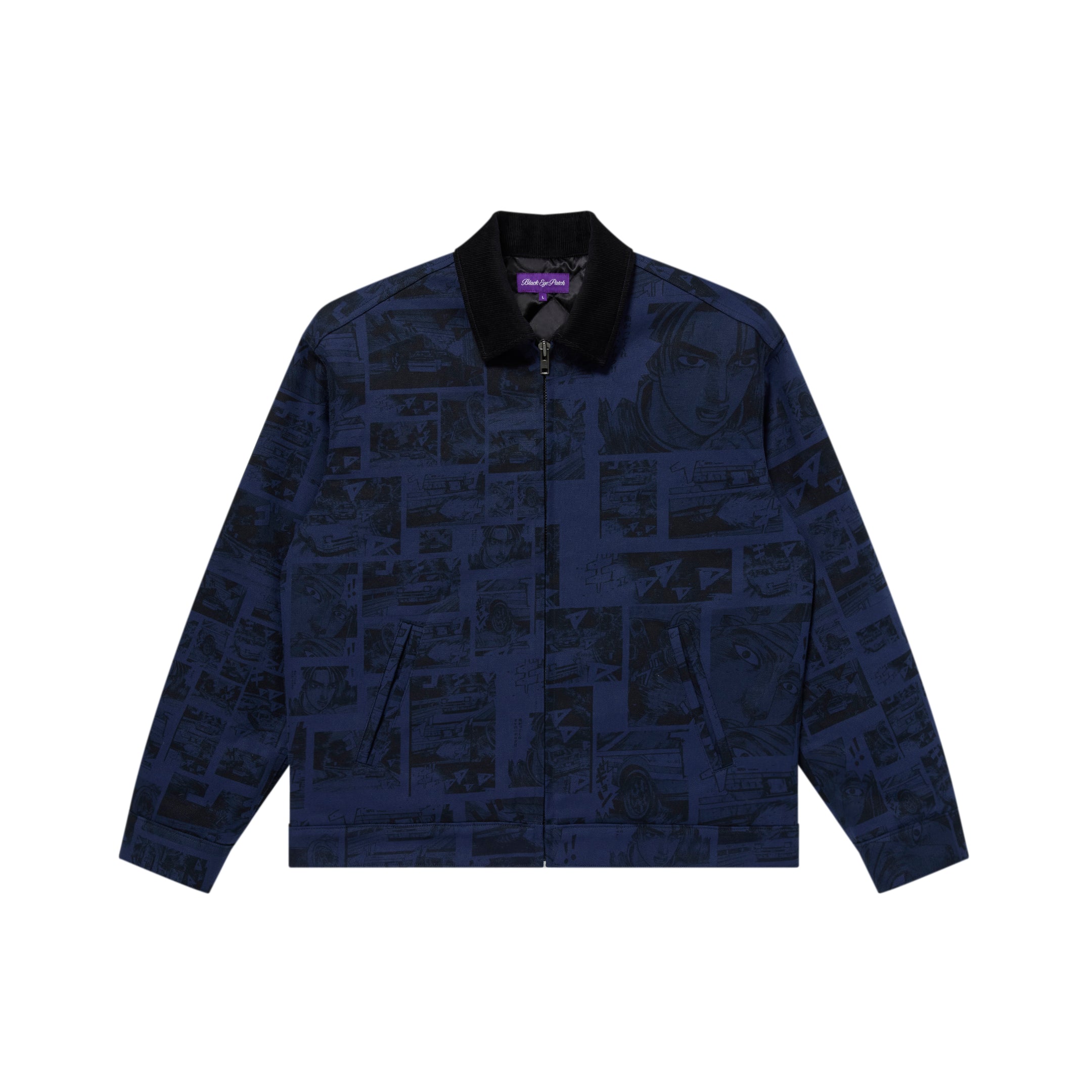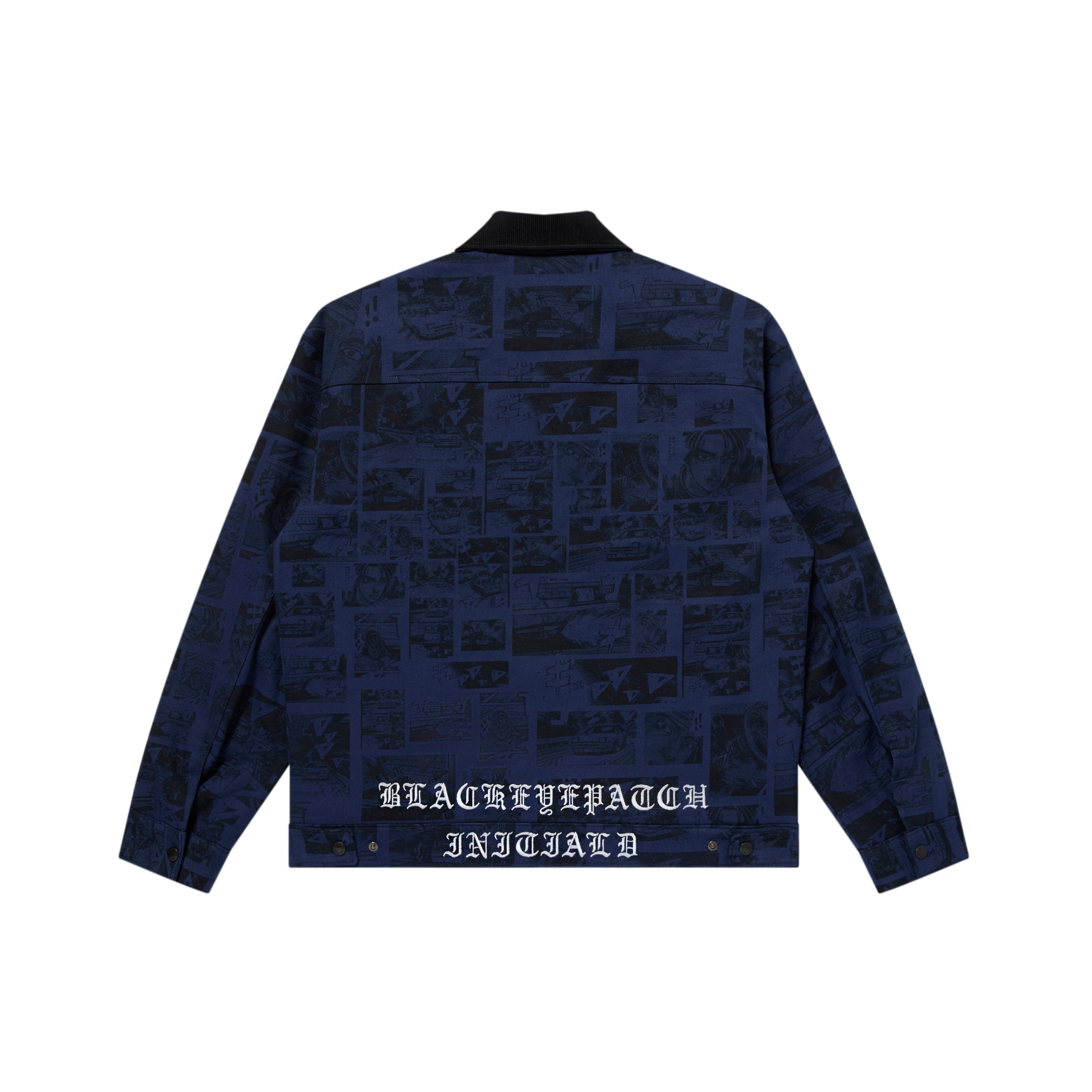 Collaboration items with the popular manga "Initial D" of 30th anniversary since serialization began. A work jacket made from duck canvas fabric featuring an all-over print collage of famous scenes from the story.