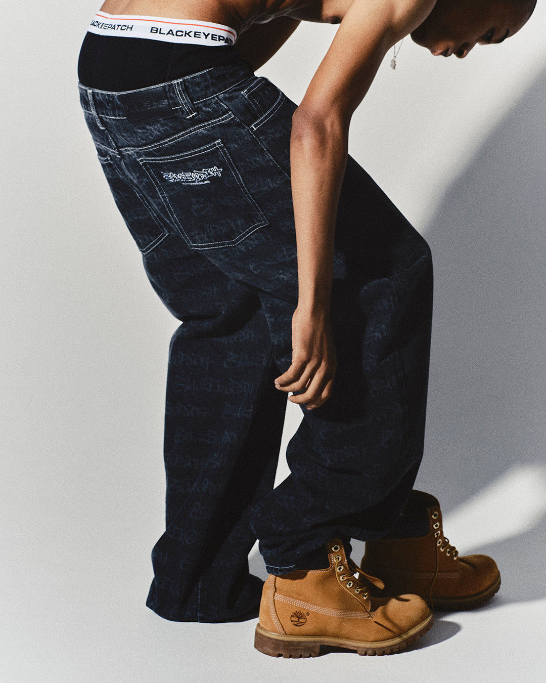 Extra baggy jeans featuring laser-printed brand name tags all over. The same graphic is embroidered on the back pockets. Made from 13.5 oz denim fabric.