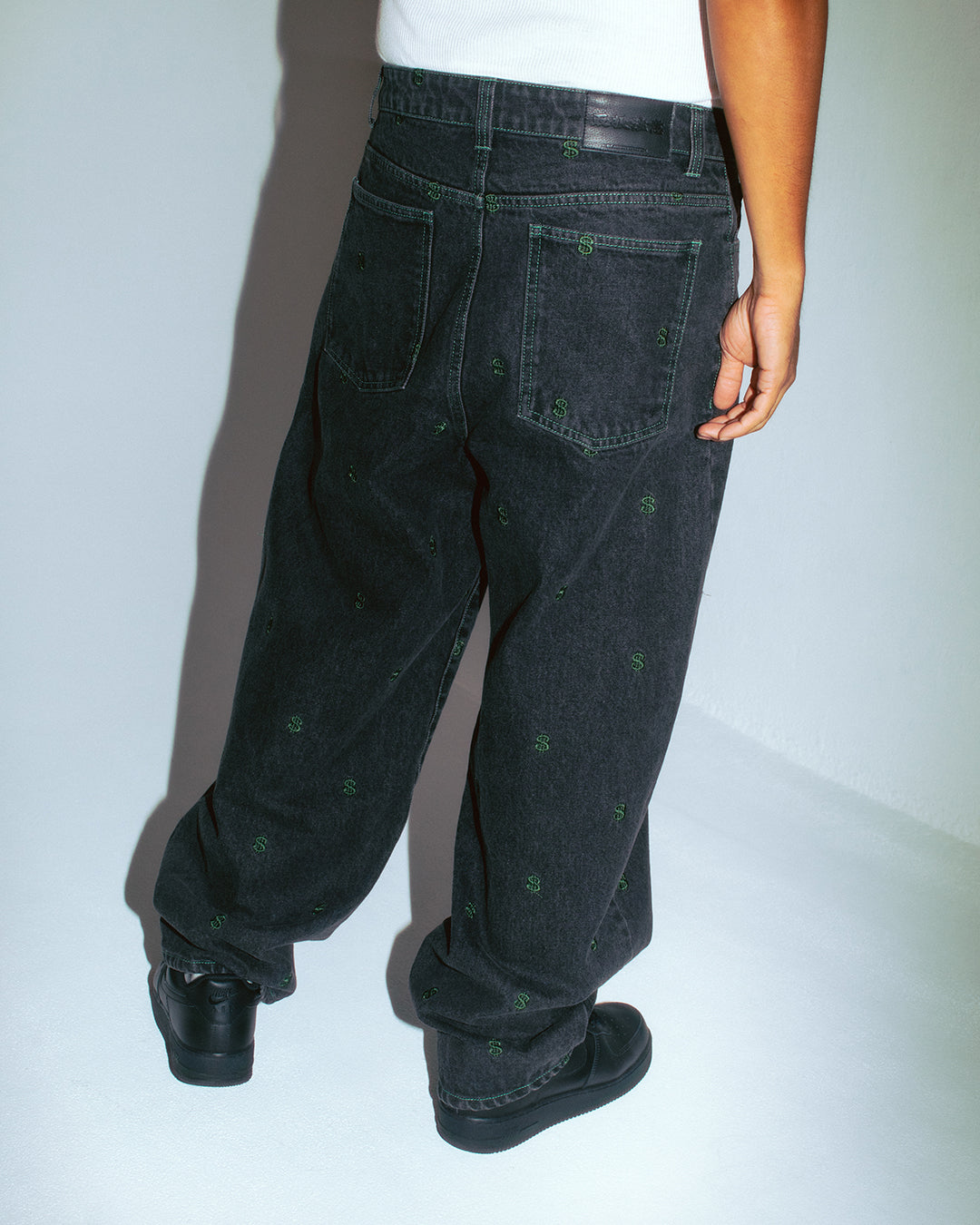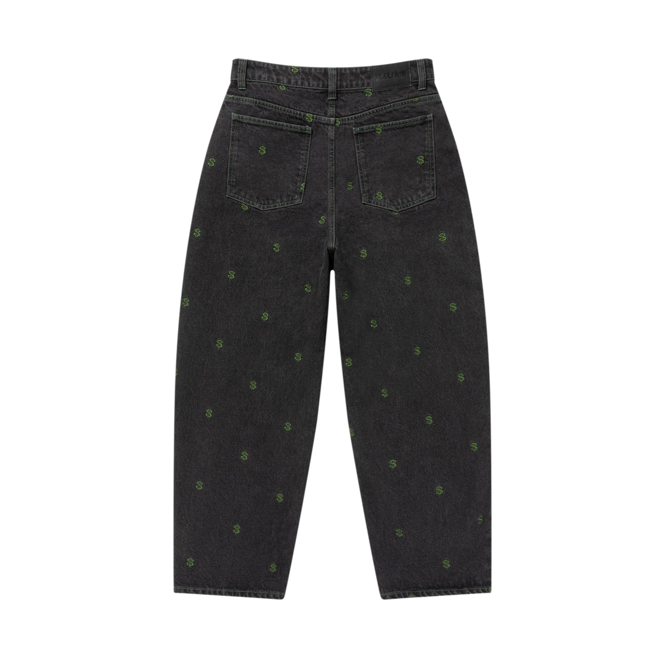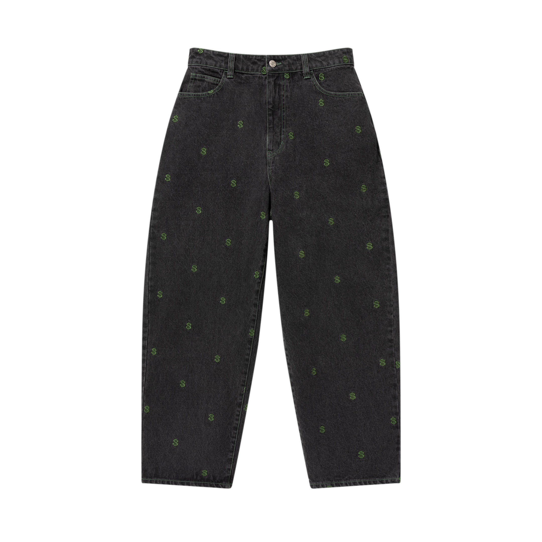 Extra baggy jeans featuring dollar-mark embroidery all over. Made of 13.5 oz. washed denim.
