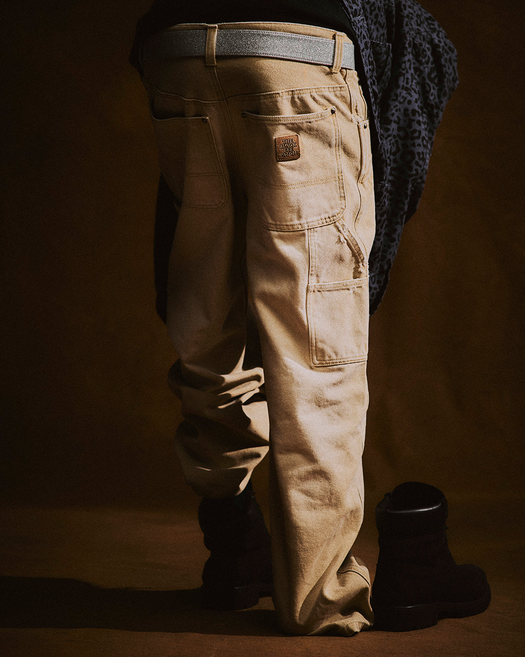 Painter pants made from vintage-inspired duck fabric featuring wash and distressing treatments.