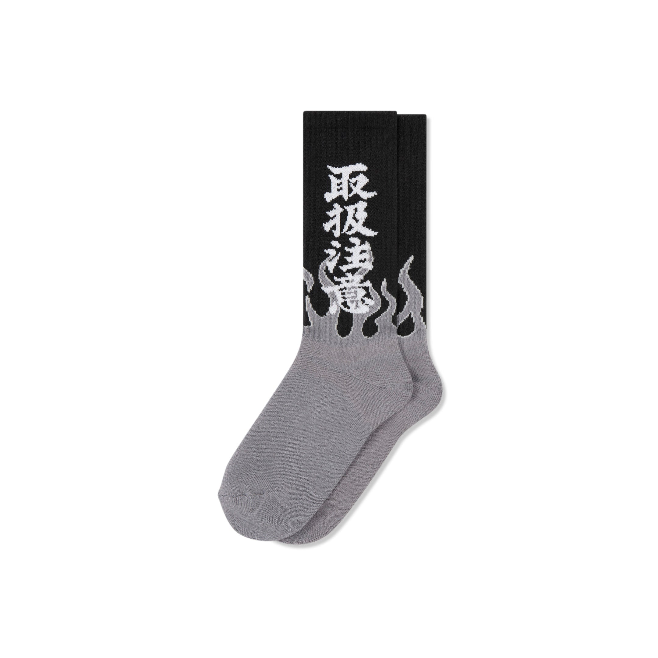 Ribbed socks featuring a graphic combining the "Handle With Care" logo and fire pattern knitted in dark tones.