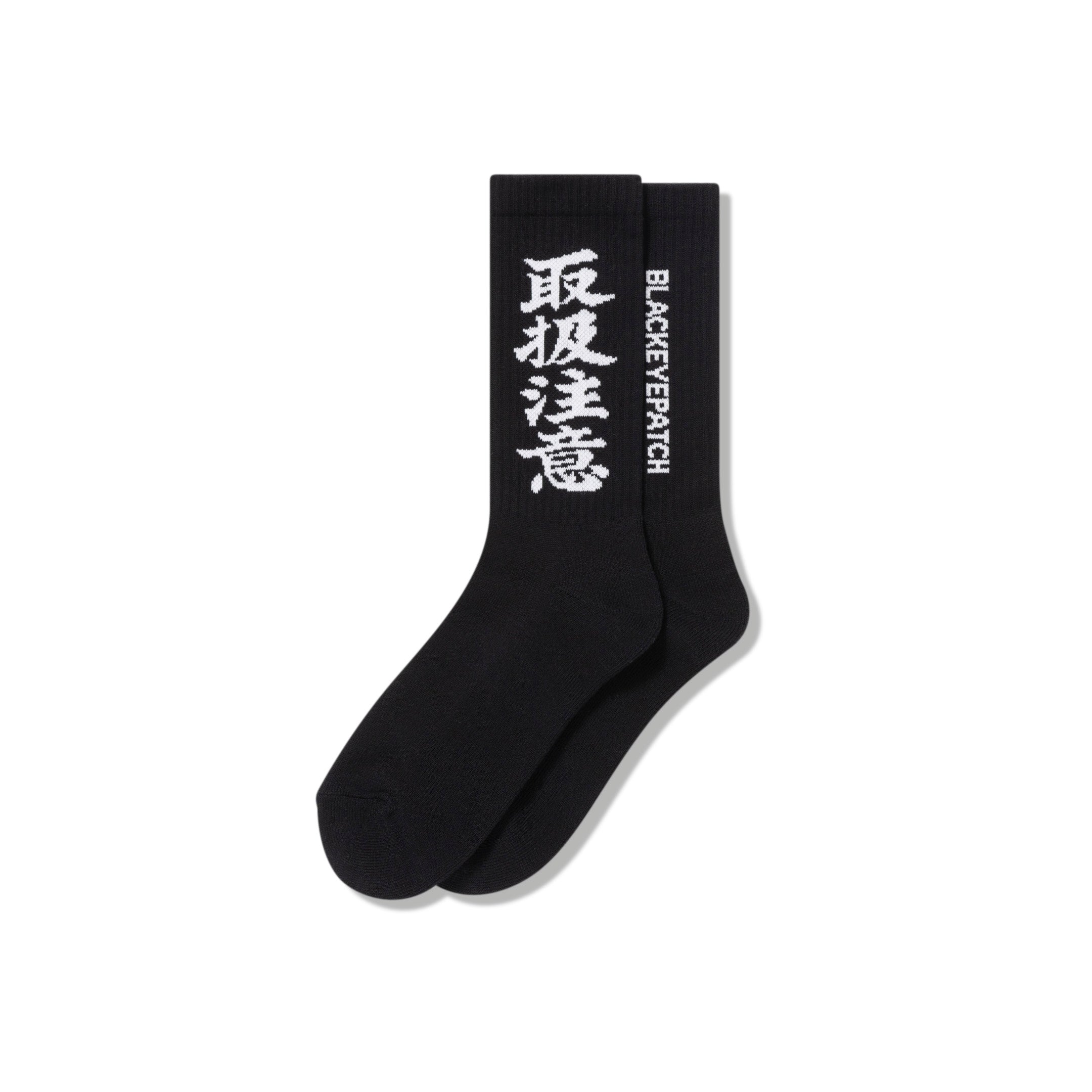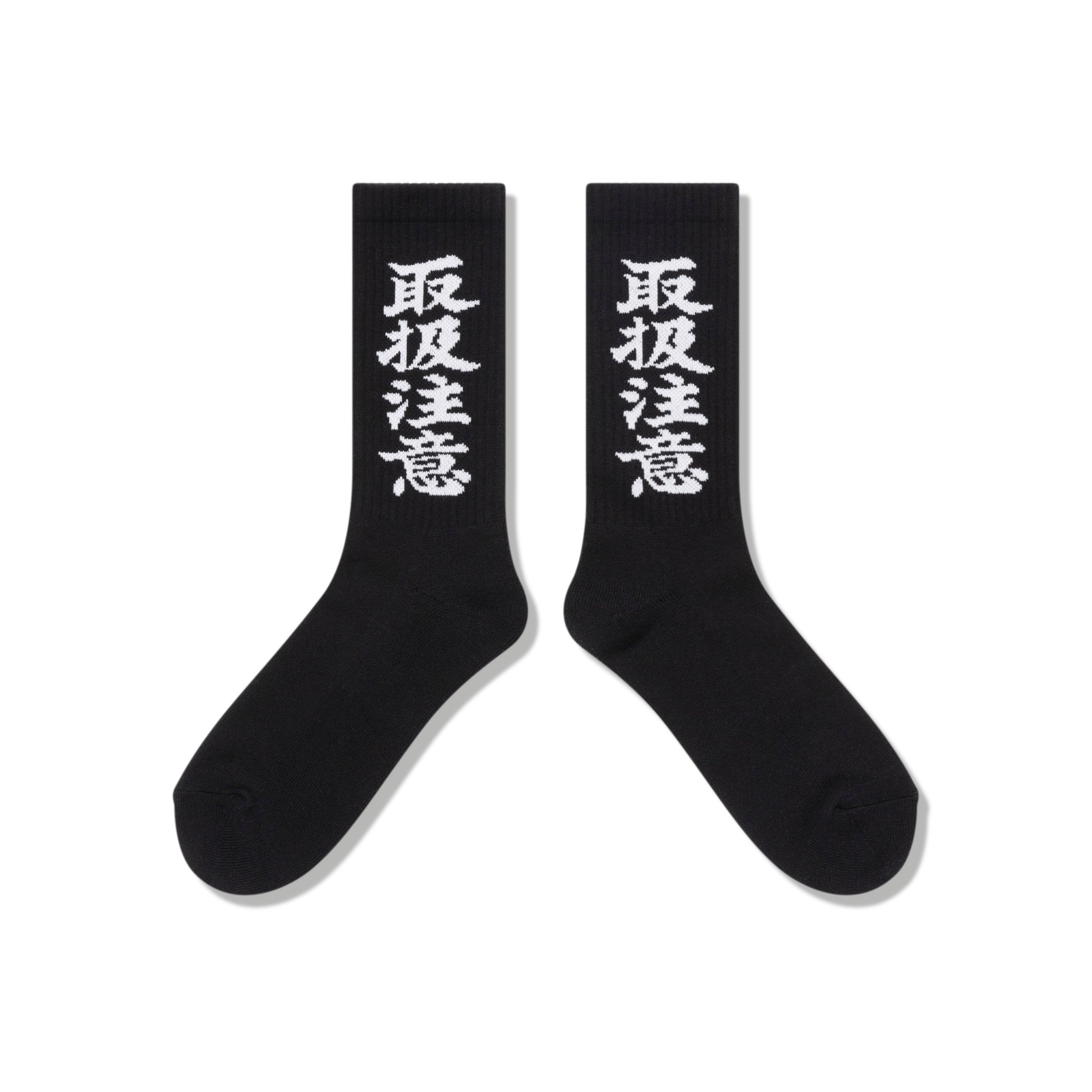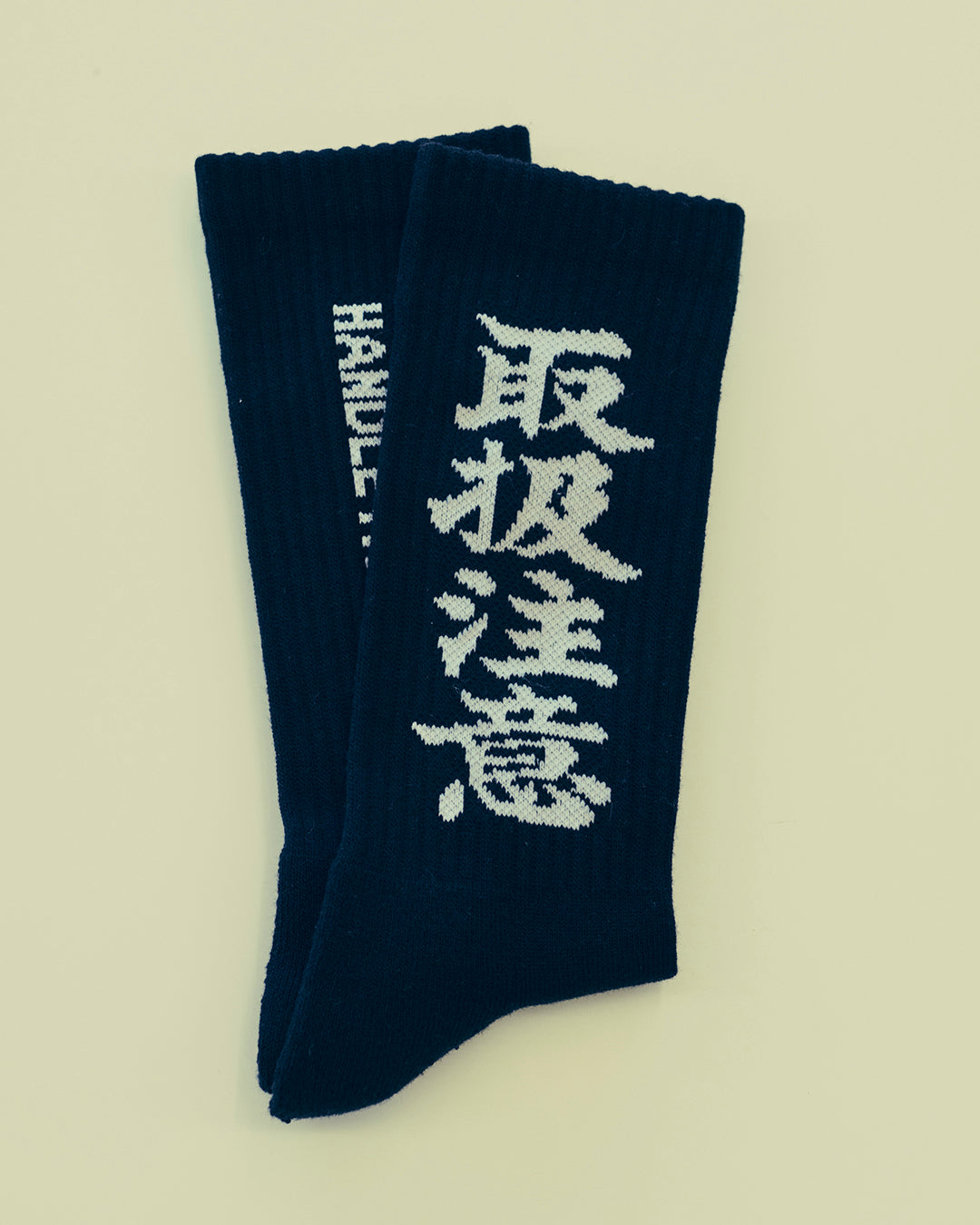 定番の "取扱注意" のグラフィックが織り込まれたソックス。