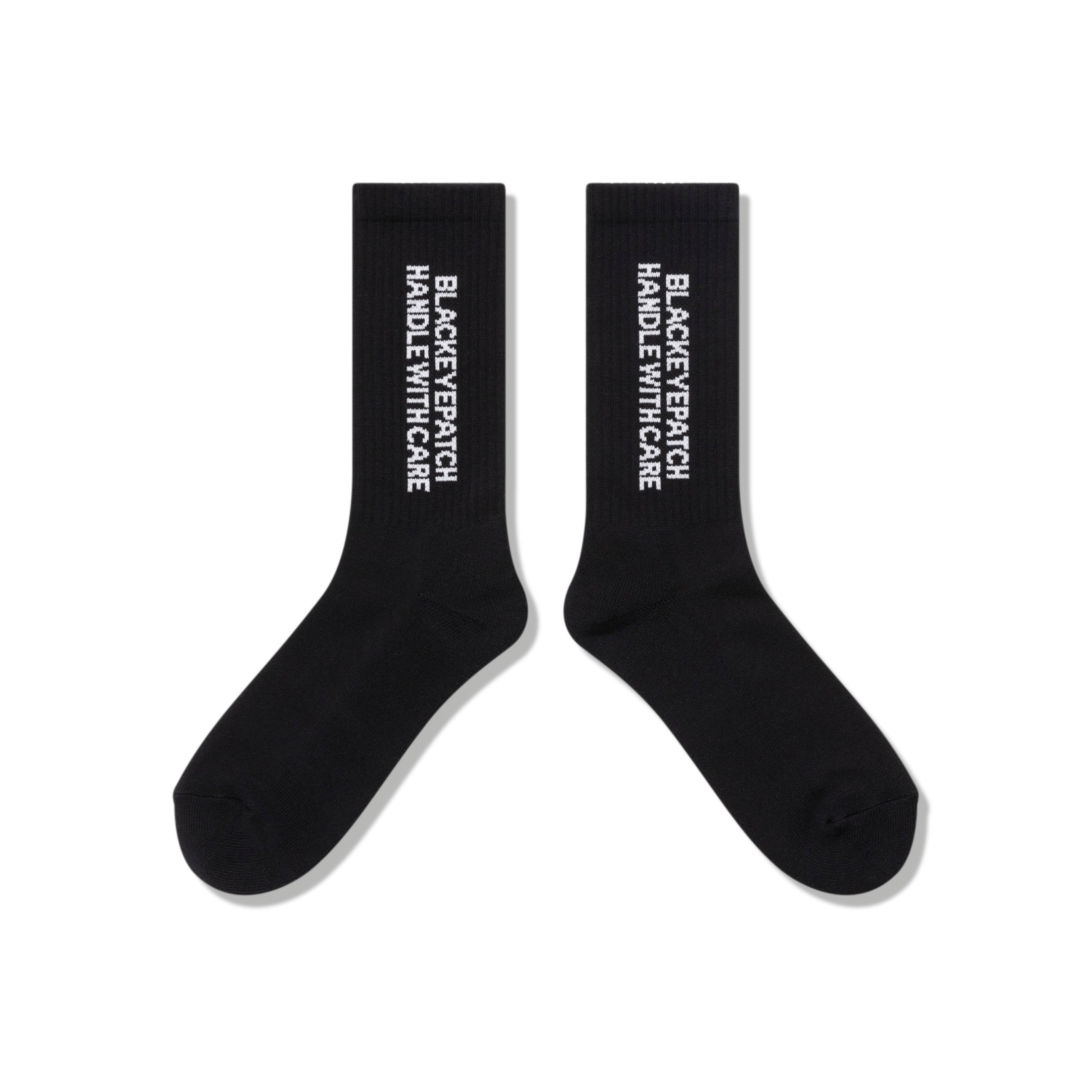 Socks featuring the standard “Handle With Care” graphic woven into them.