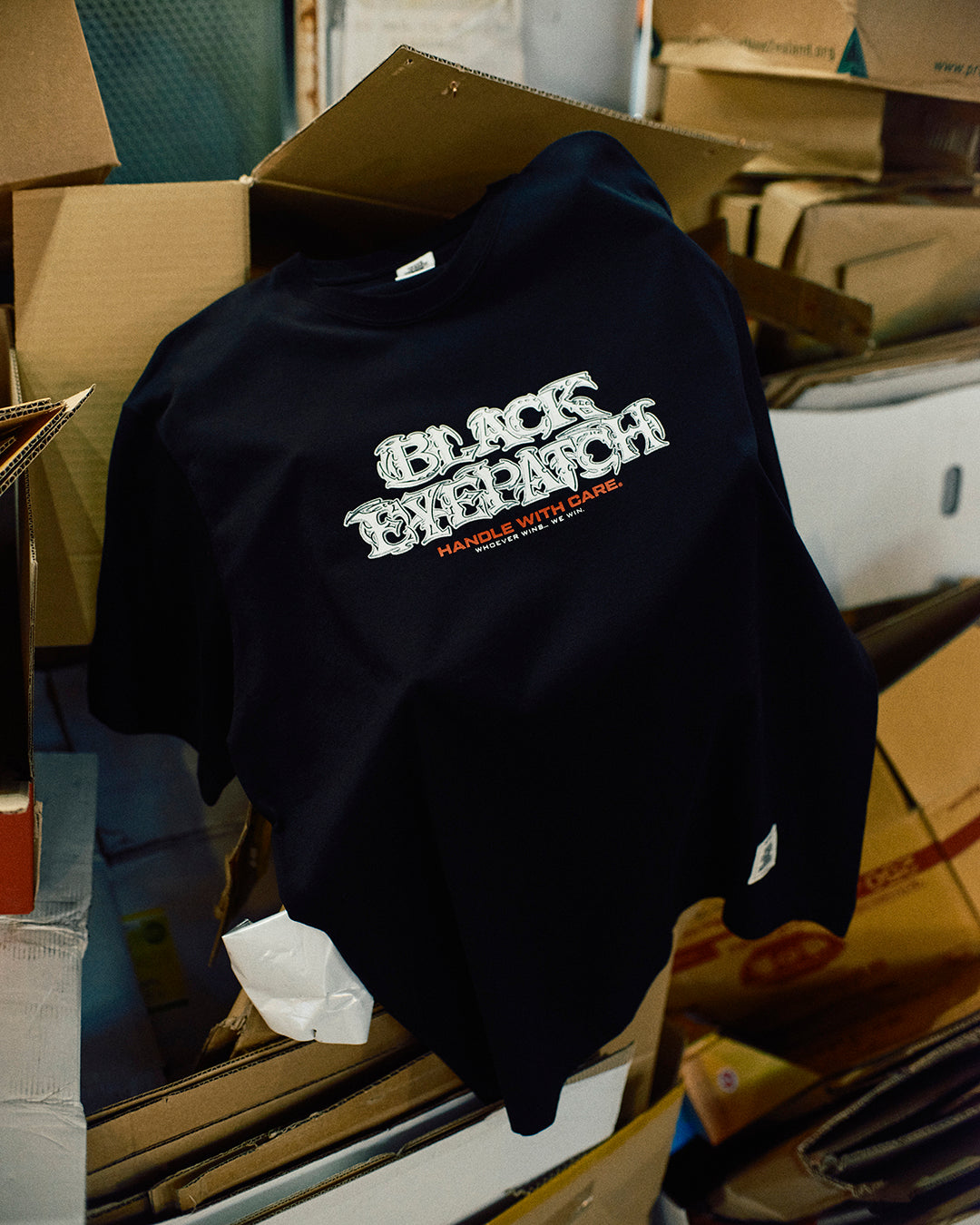 A 8.5oz t-shirt featuring the brand name printed in a graphic style reminiscent of 2000s metal bands. A label indicating it is an authentic brand product is attached to the hem.