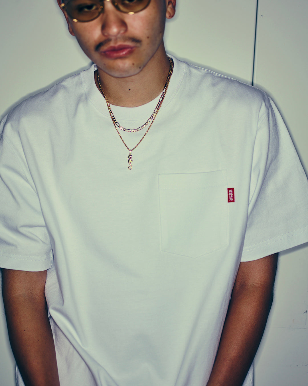"取扱注意" のピスネームをポケットに取り付けたポケット T シャツ。