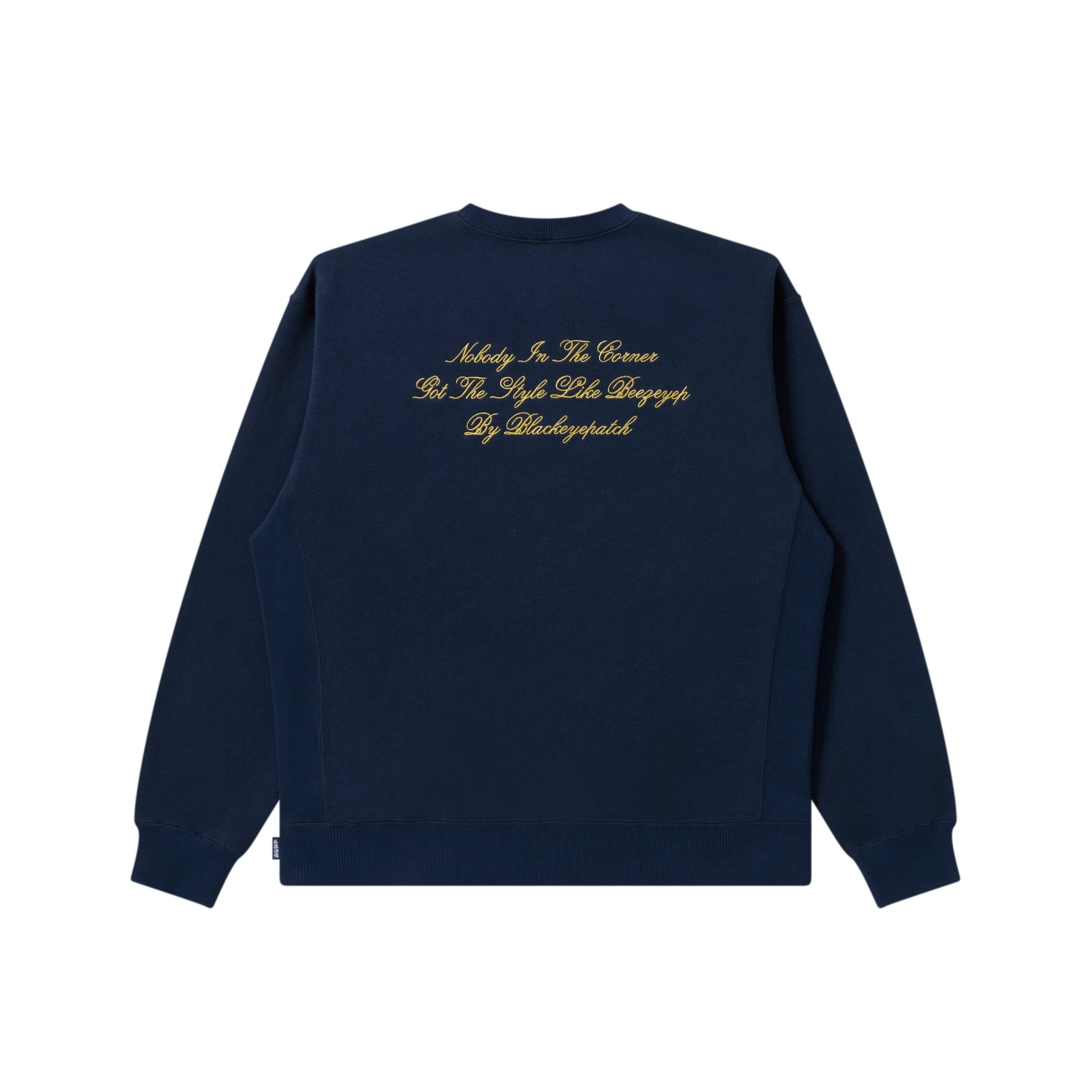 A crew neck sweatshirt with the brand logo in a cursive font on the front and a message embroidered on the back.