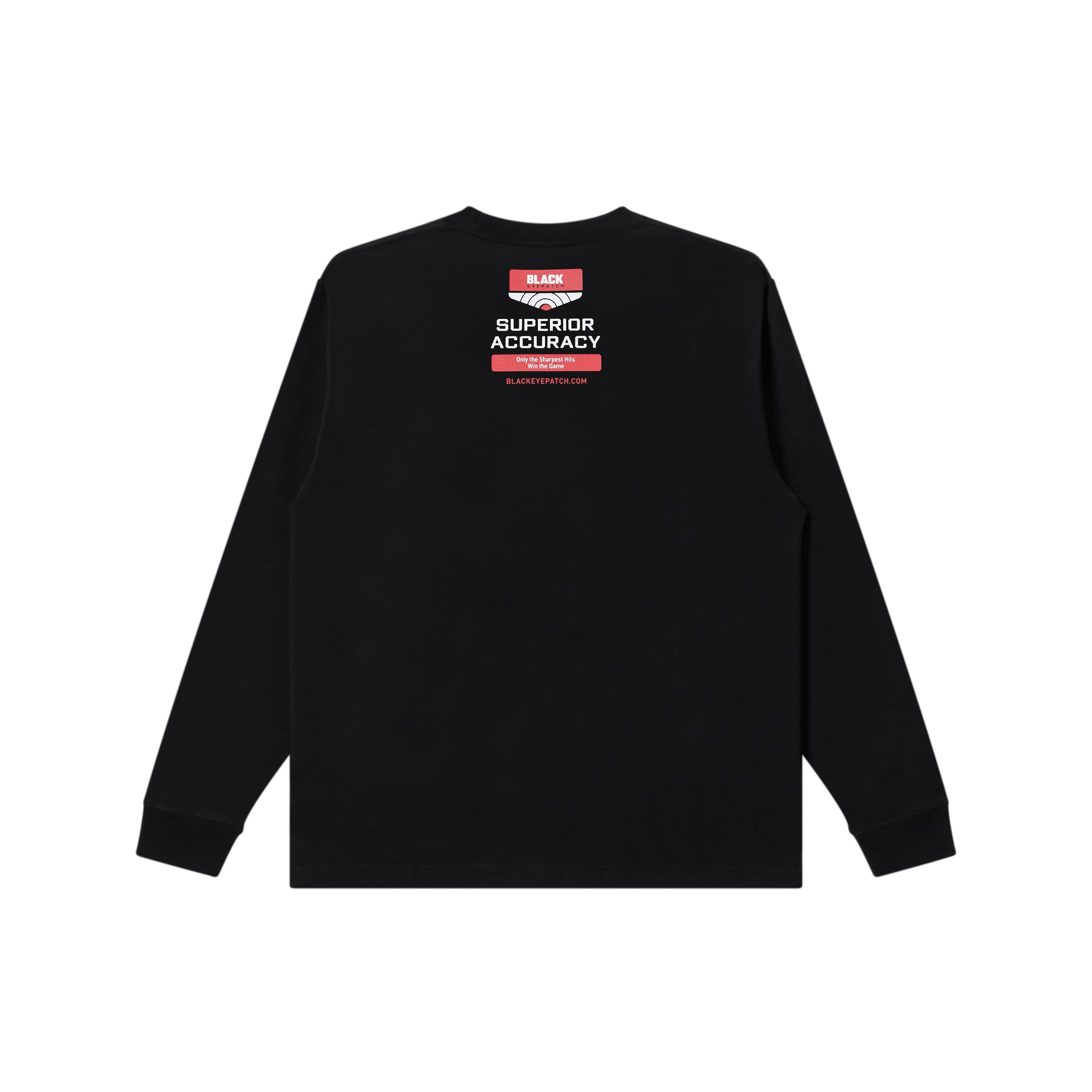 A 8.5oz long-sleeve t-shirt featuring a large brand logo spanning from the body to the sleeves and a target graphic printed on the front. The back graphic samples the logo of a US shooting equipment brand.