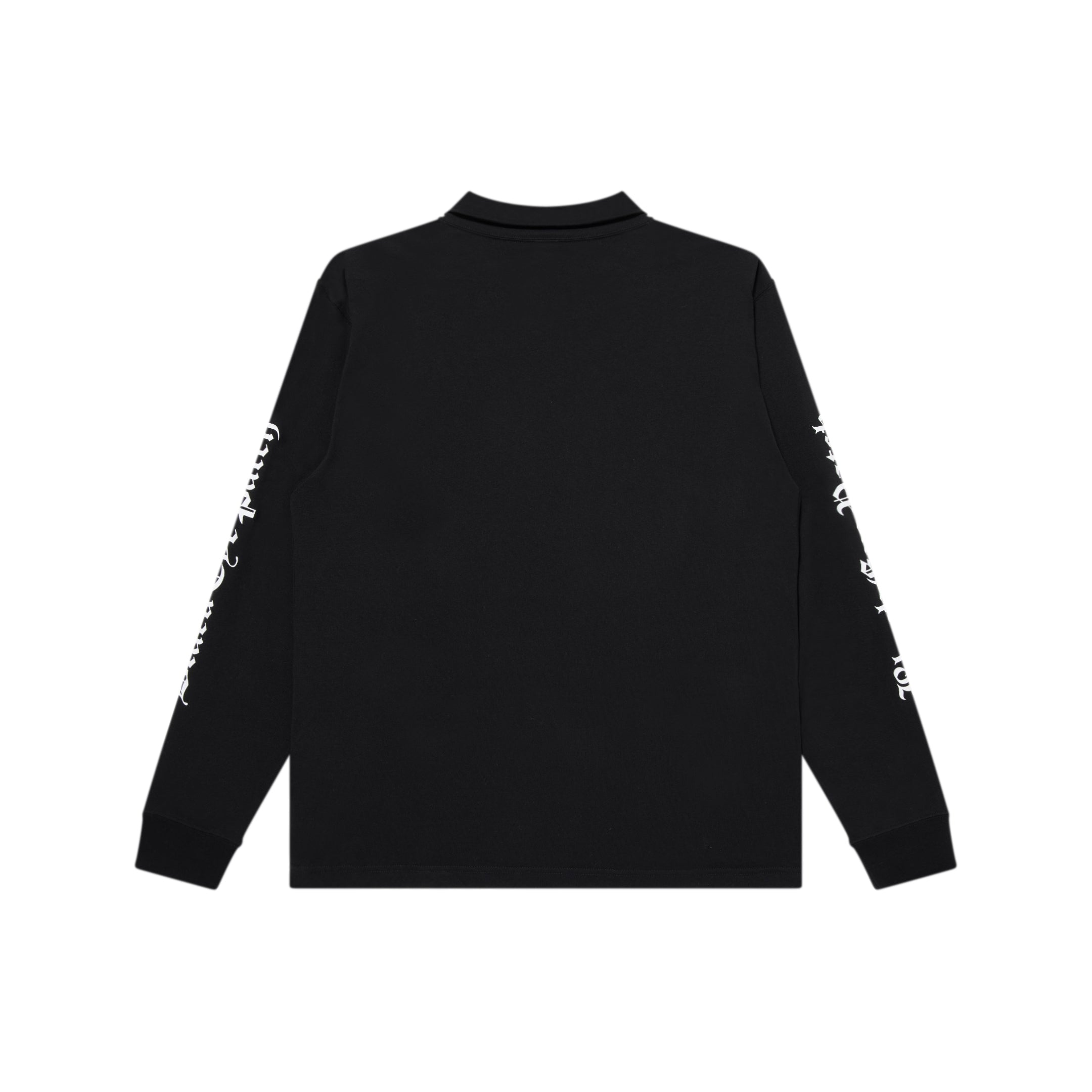 A 8.5oz mock neck long-sleeve t-shirt. The neck features embroidered O.E. logo, while the sleeves bear printed brand logos.