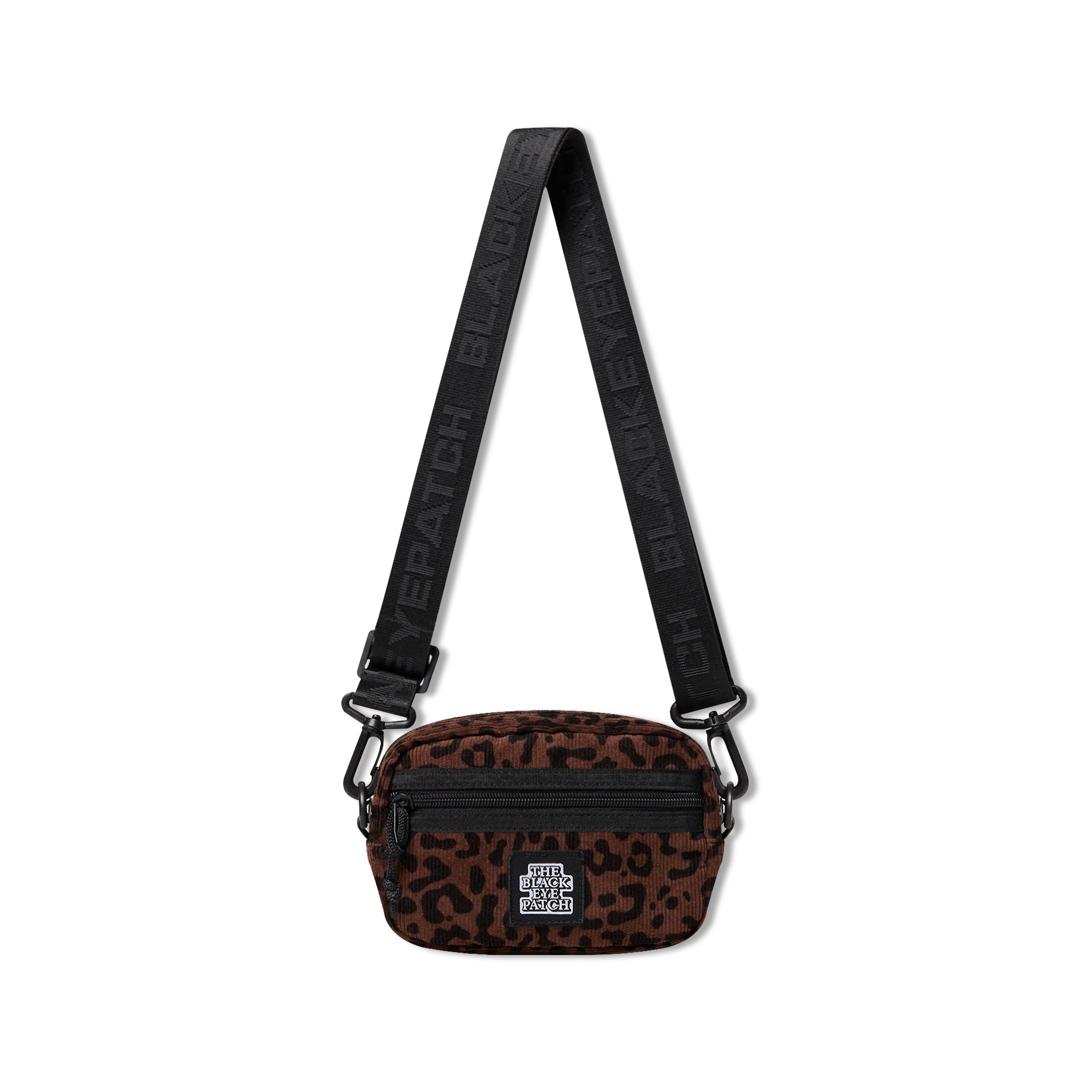 A shoulder pouch made of corduroy fabric printed with an original leopard pattern.