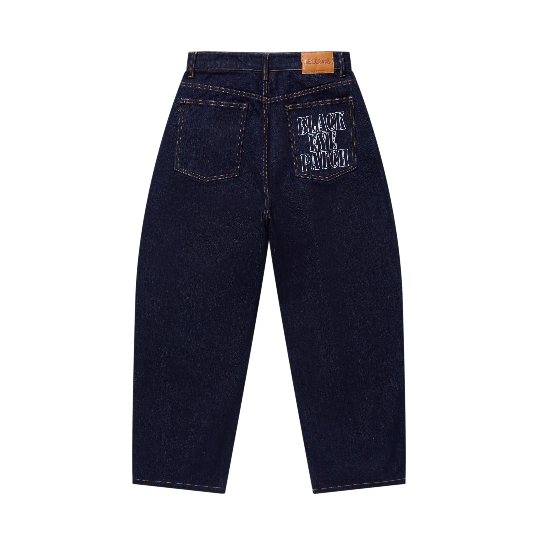 Extra baggy jeans crafted from one-wash denim fabric featuring a stencil logo embroidered on the back pocket.