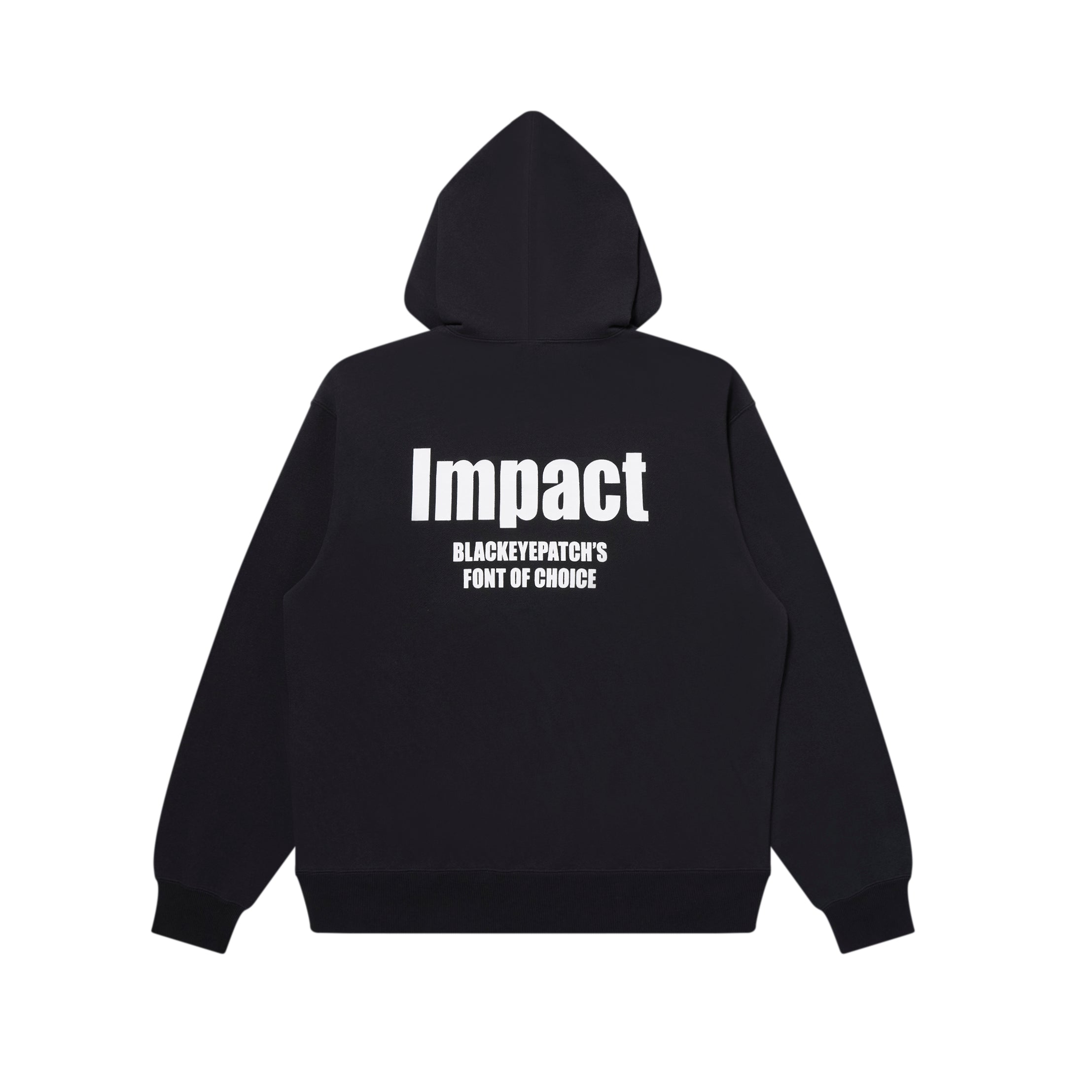 Impact フォントを使用して「Impact」の文字をプリントしたプルオーバーフーディ。