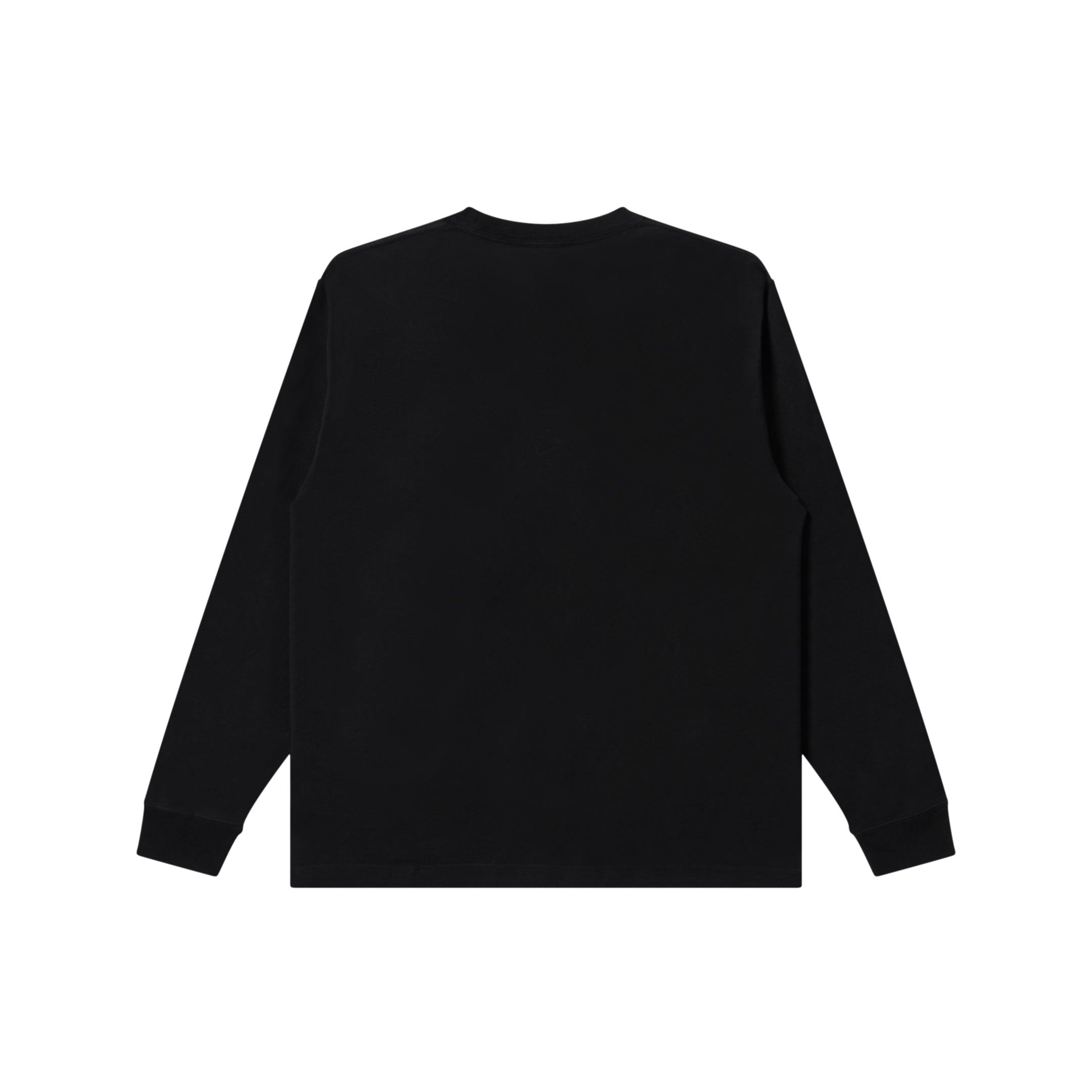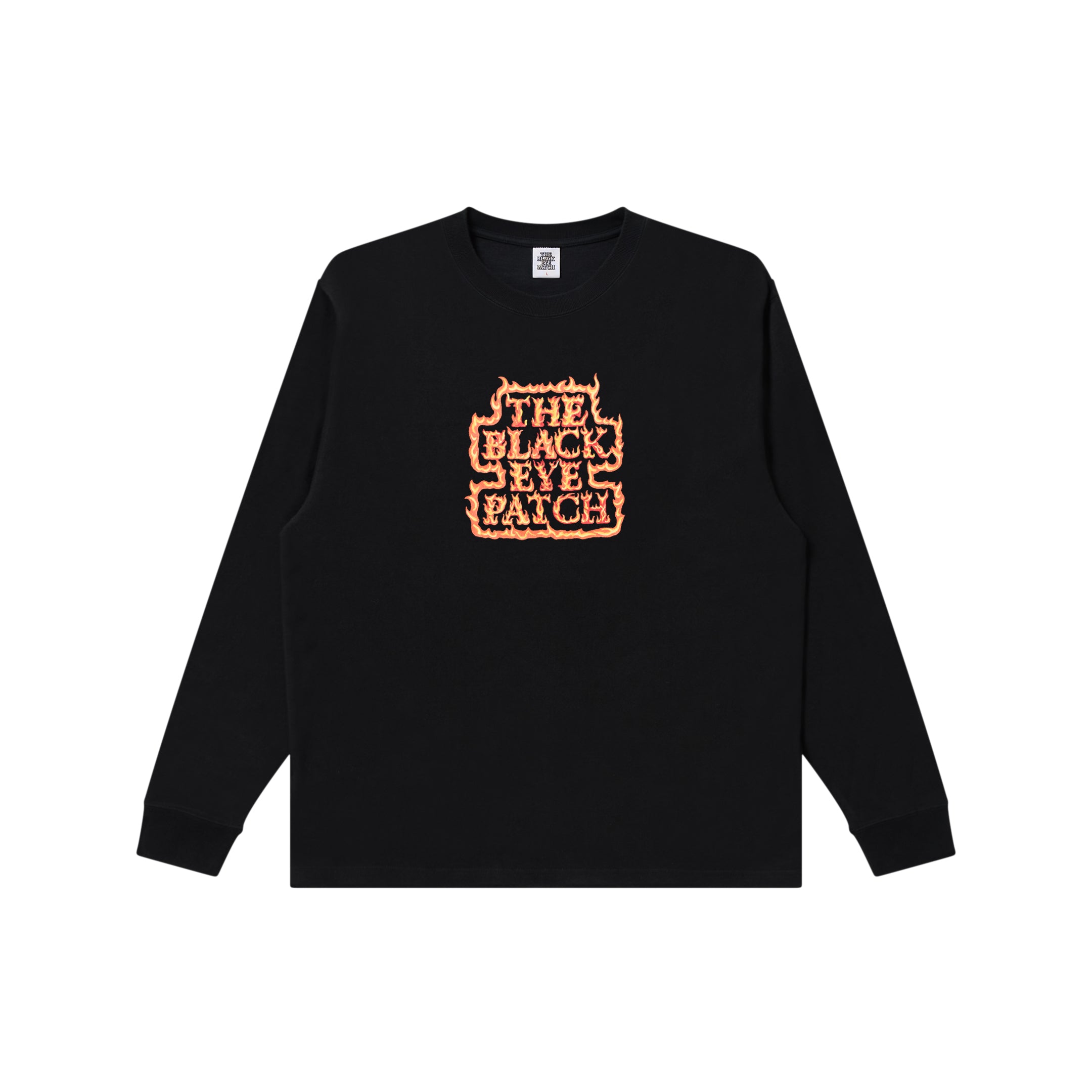 A 8.5oz long-sleeve t-shirt featuring a graphic print of the “OG LABEL” logo rendered in flames.