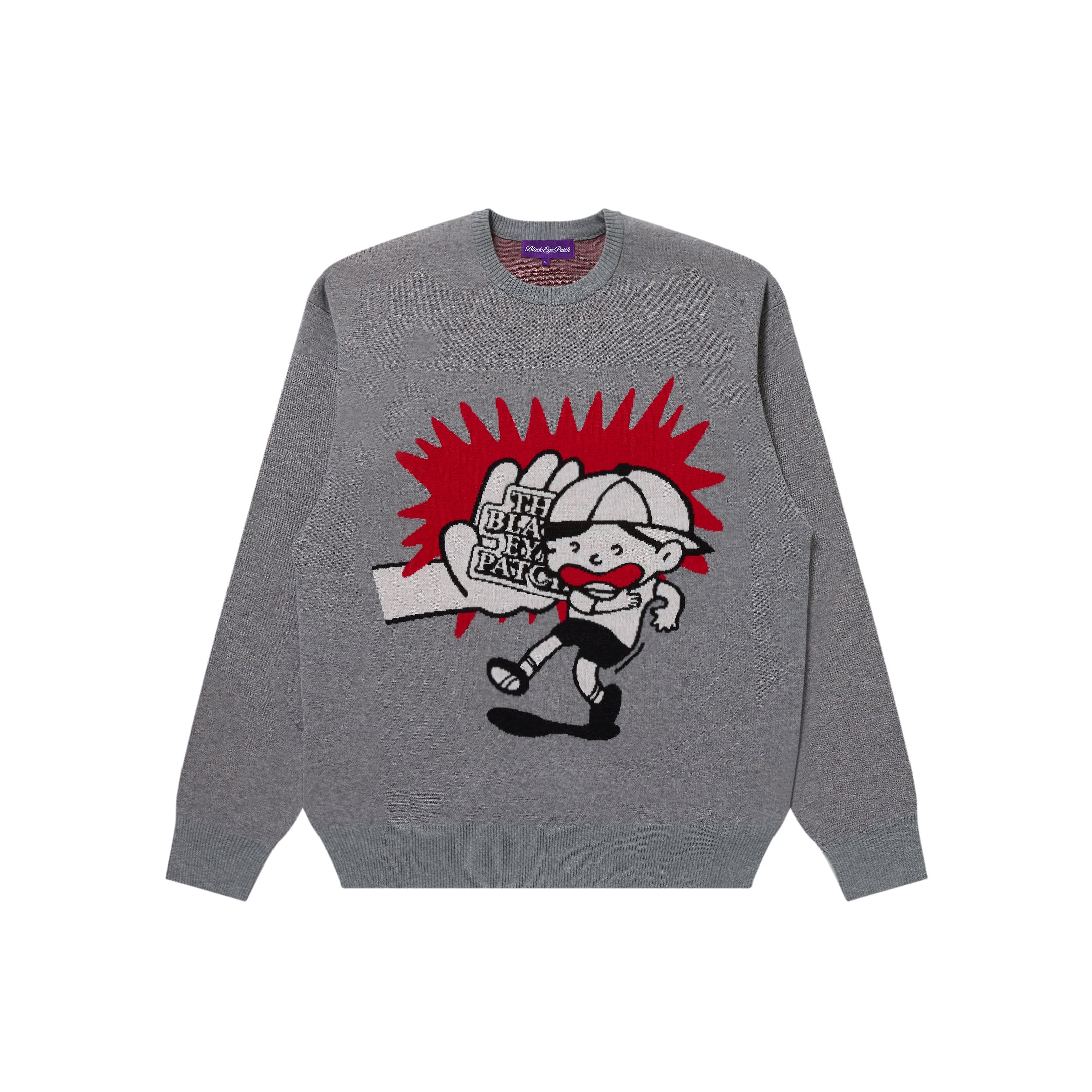 Crewneck knit featuring a large graphic inspired by a "Beware of Children Darting Out" sign. Material composition: 55% acrylic, 45% cotton.