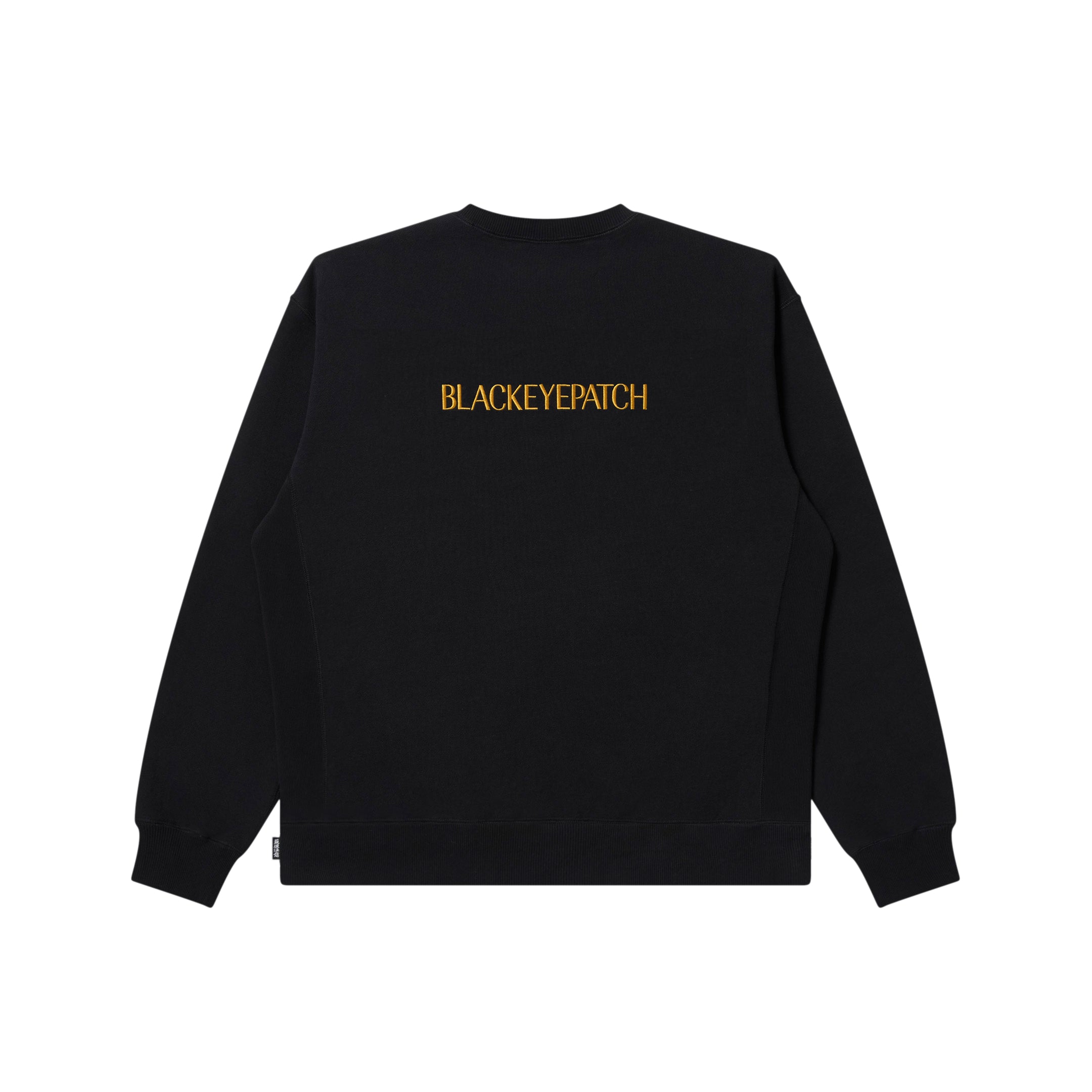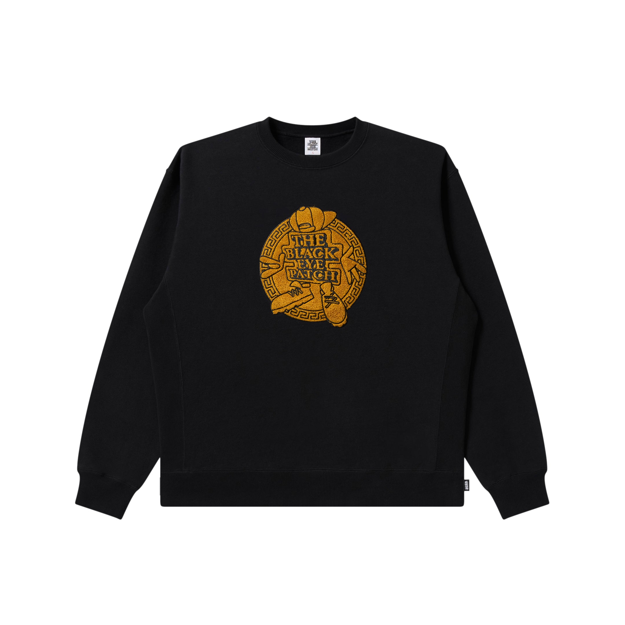 A 12.5oz crewneck sweatshirt featuring an OG BOY sagara patch on the front, styled in a VERSACE-inspired arrangement, with the brand logo embroidered on the back.