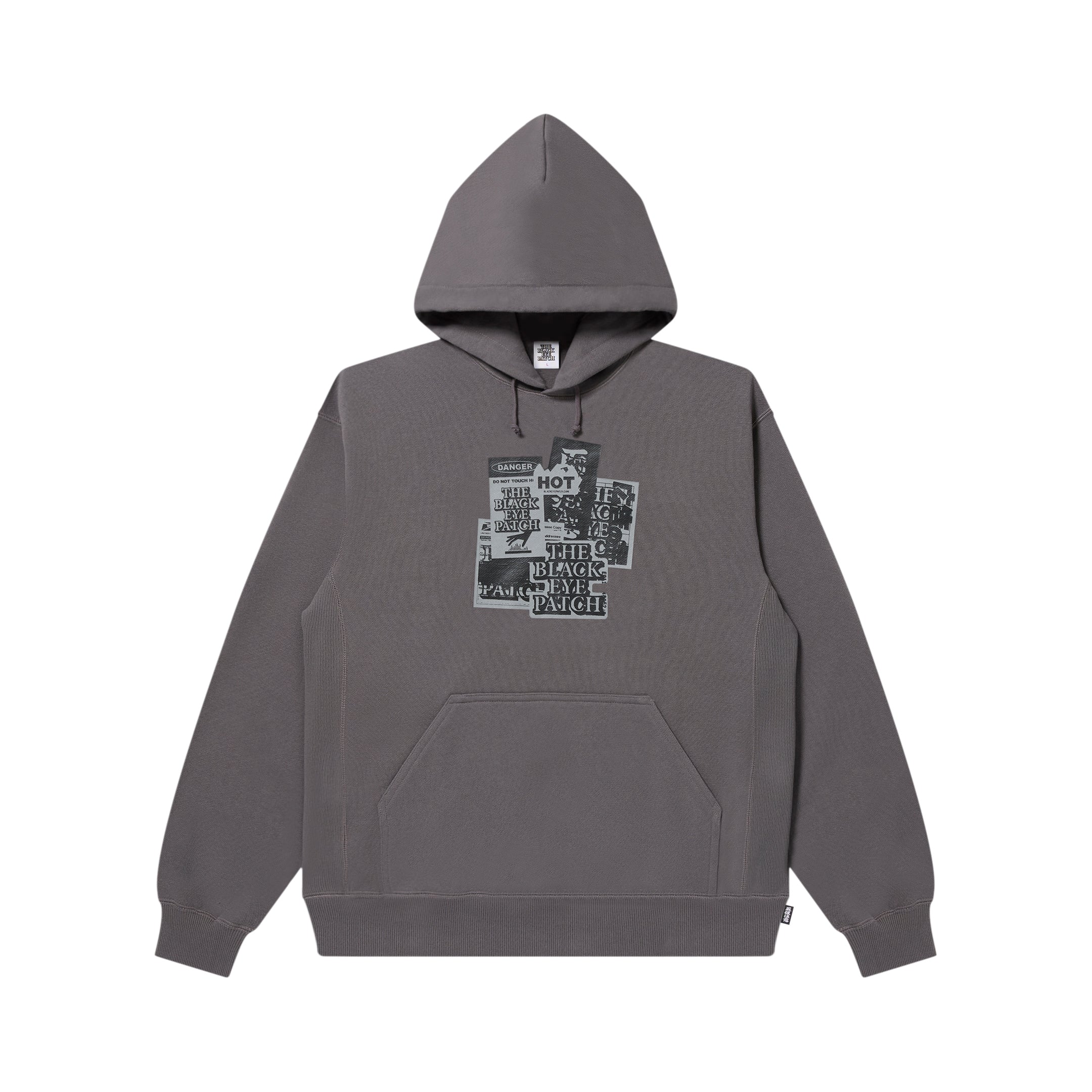 A 12.5oz pullover hoodie featuring the "LABEL PACK"—a collection of BEP's signature label logos—printed in matching dark tones on both sides.