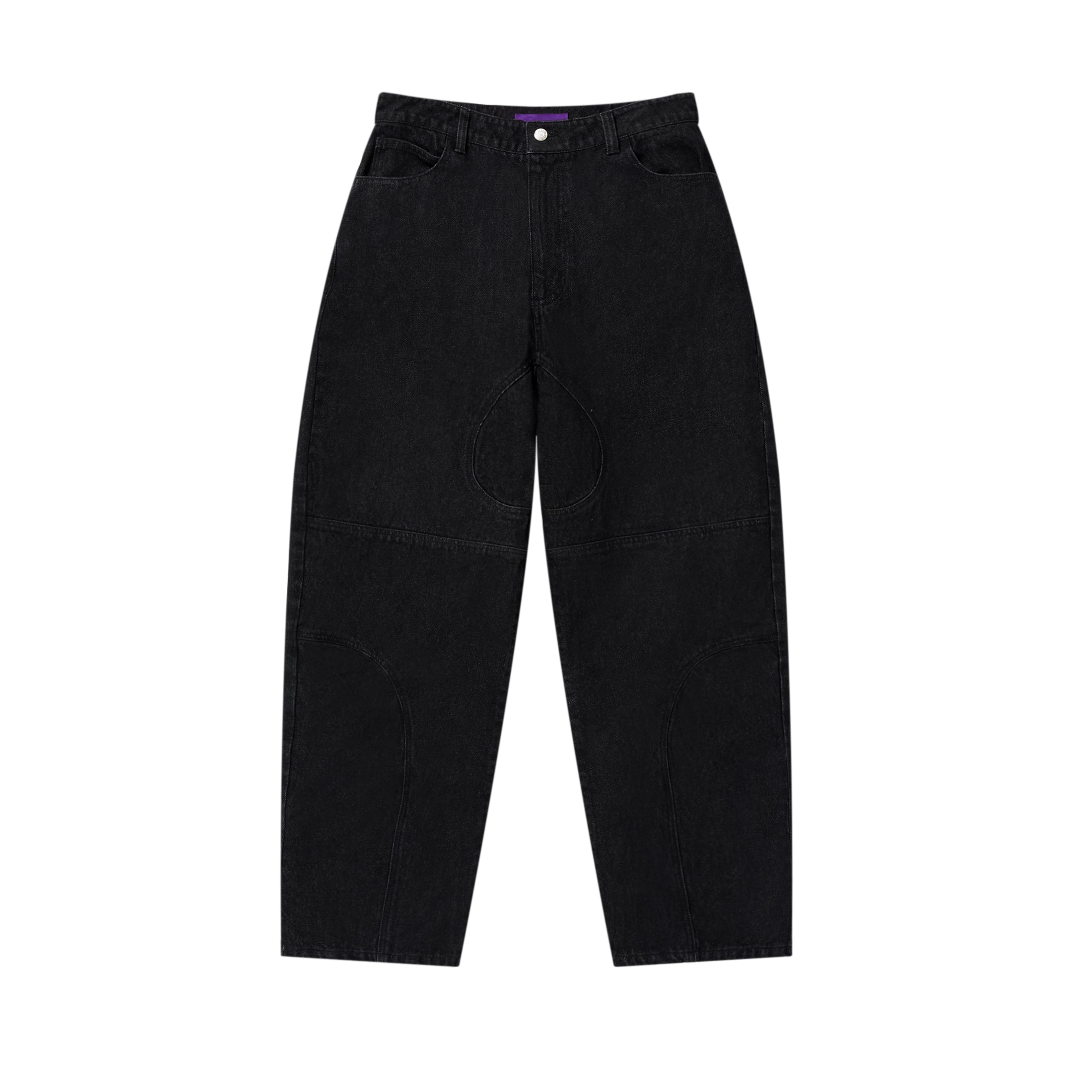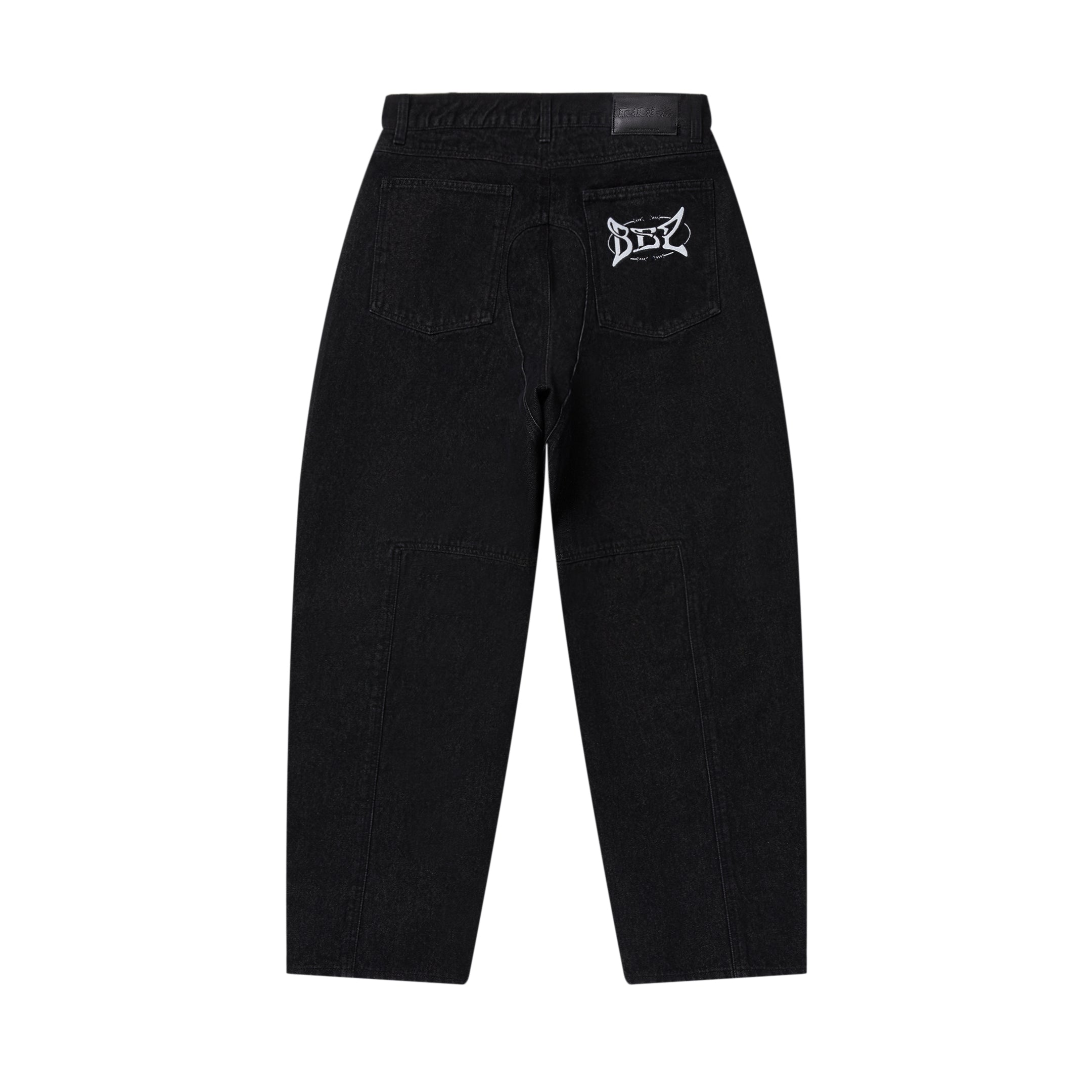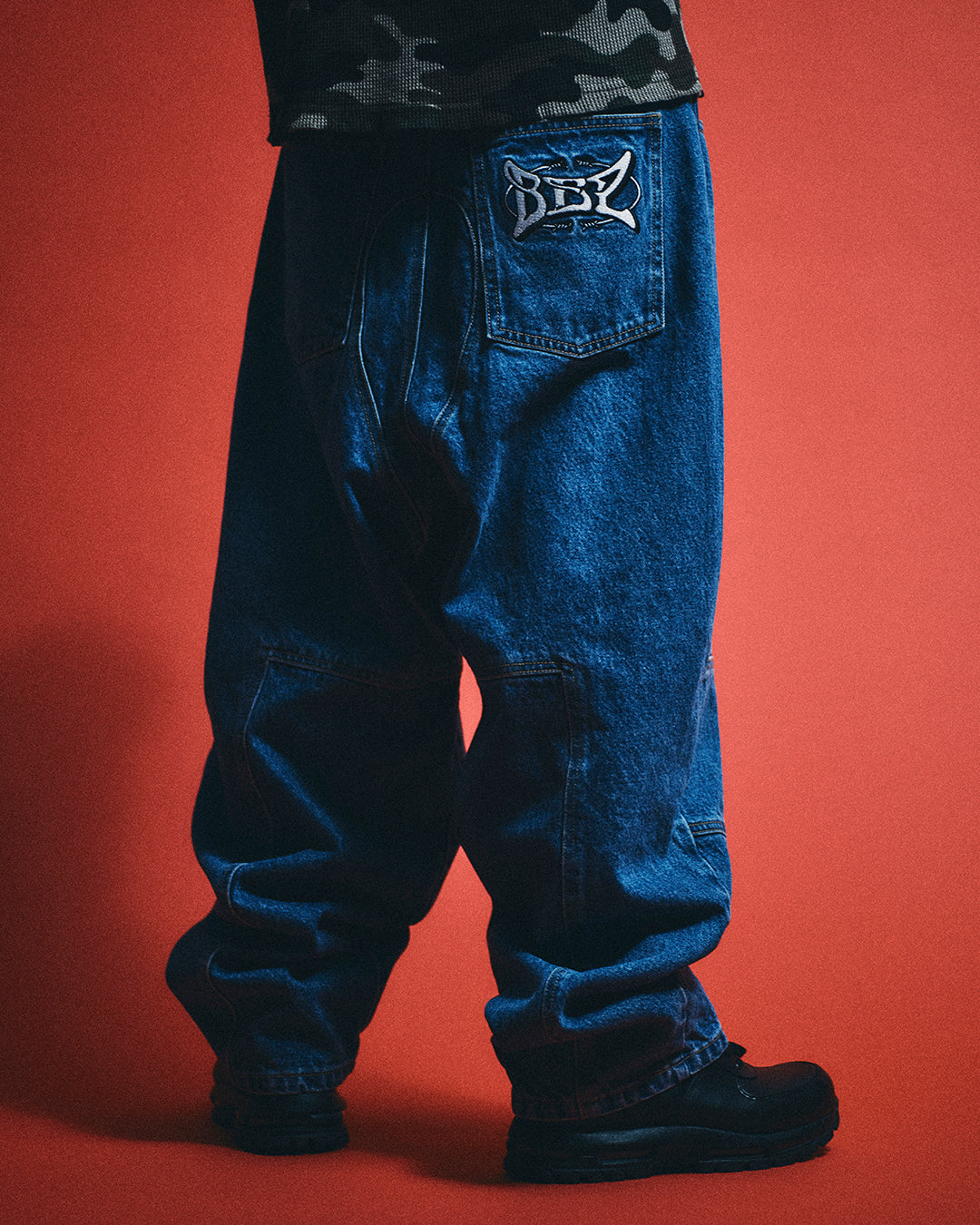 Denim jeans featuring paneled details inspired by motocross pants. Back pockets feature embroidered logos, with a silhouette identical to the Extra Baggy style.
