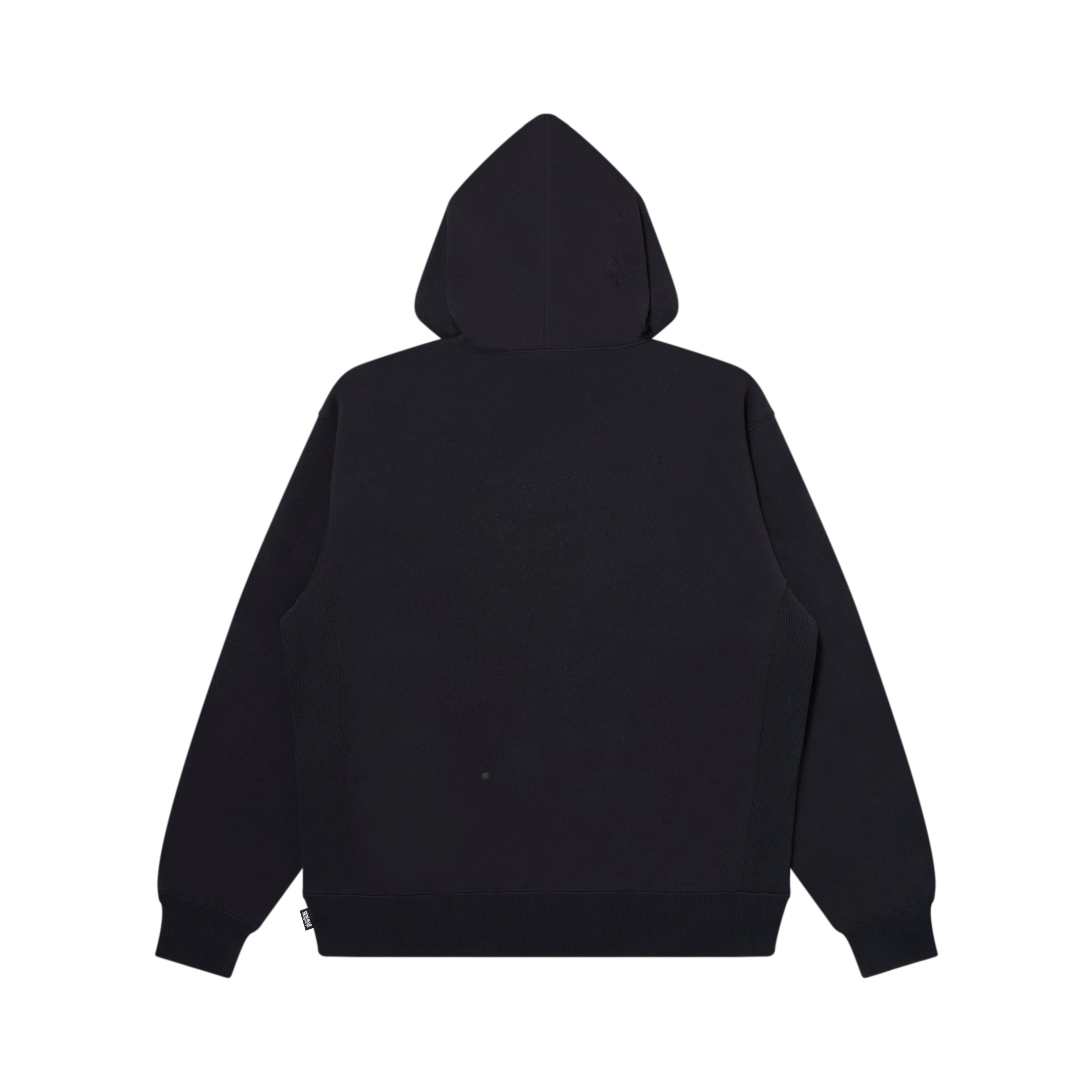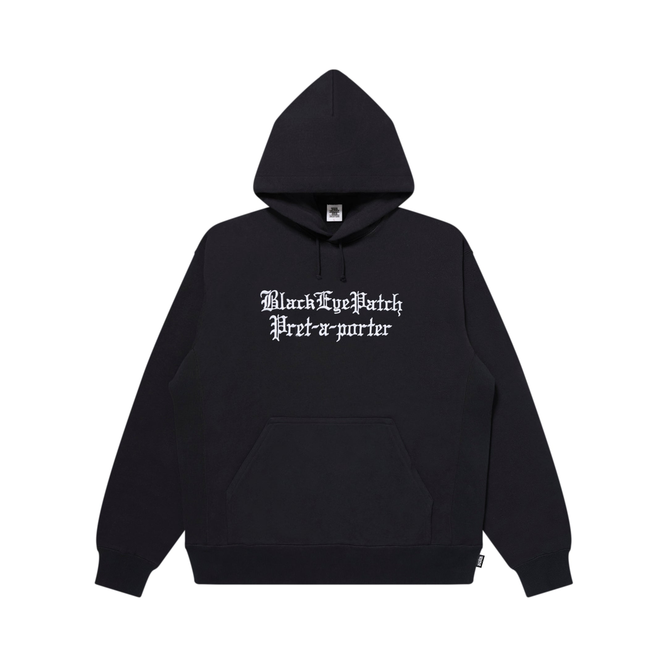A 12.5oz pullover hoodie featuring a three-dimensional embroidered graphic of the French term "Pret-A-Porte" (ready-to-wear).