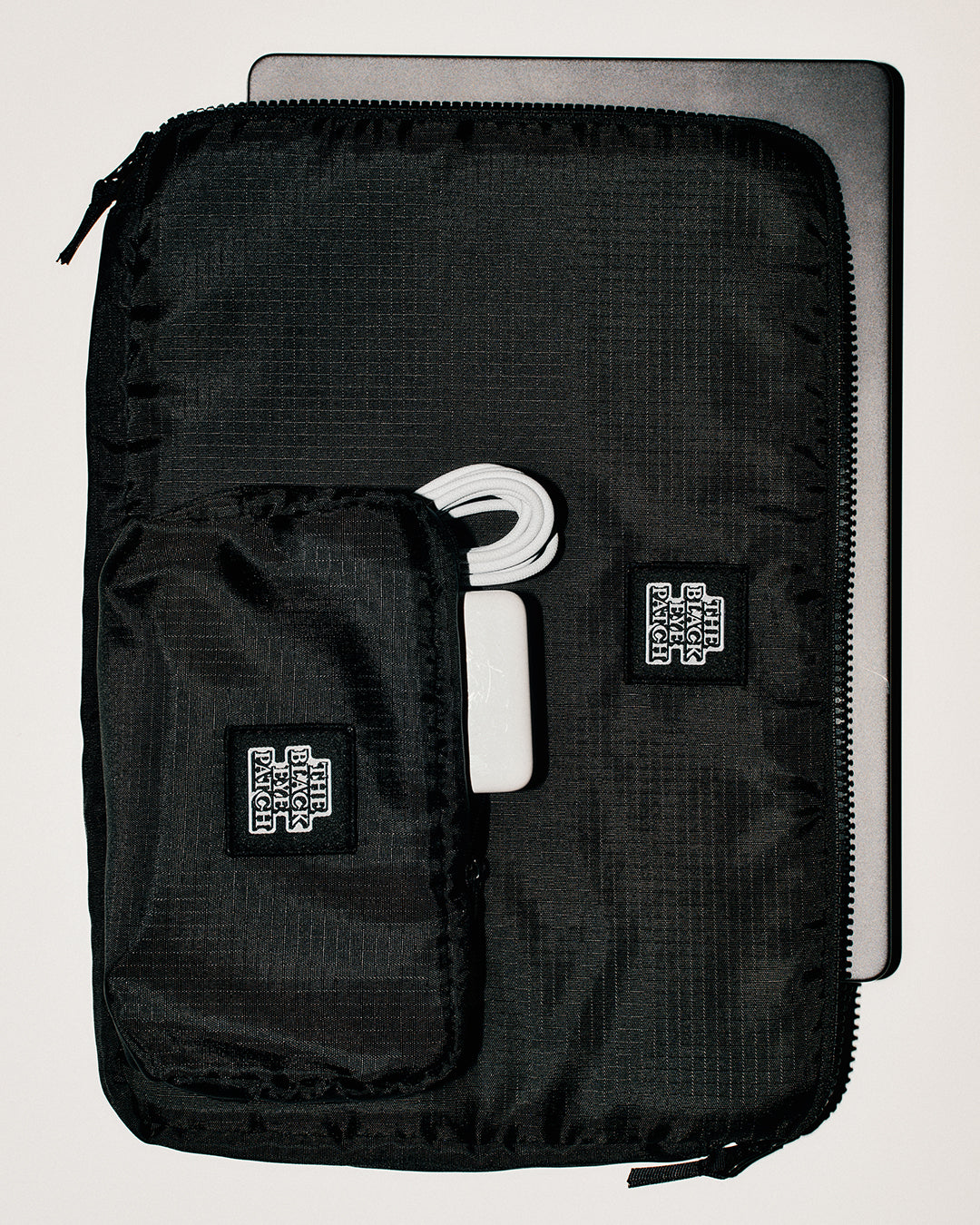 PC スリーブと同じリップストップ生地を使用したミニポーチ。フロントにはロゴパッチ。