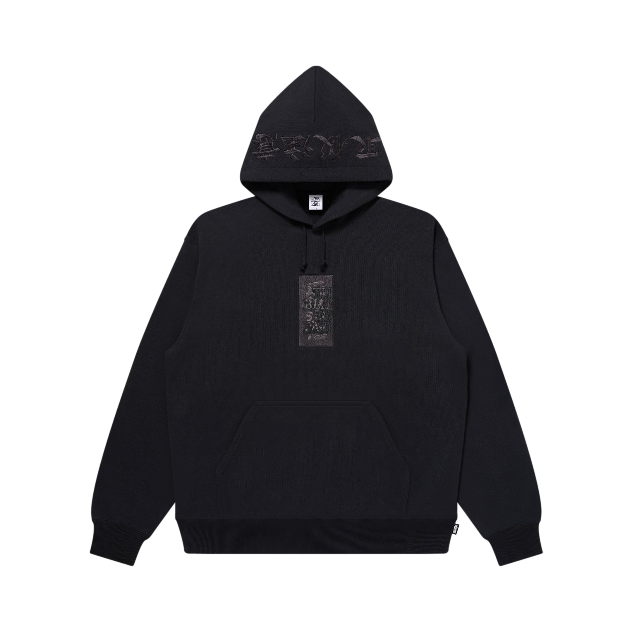 "取扱注意" LABEL のグラフィックをボディと同系色で表現し刺繍で施したプルオーバーフーディー。