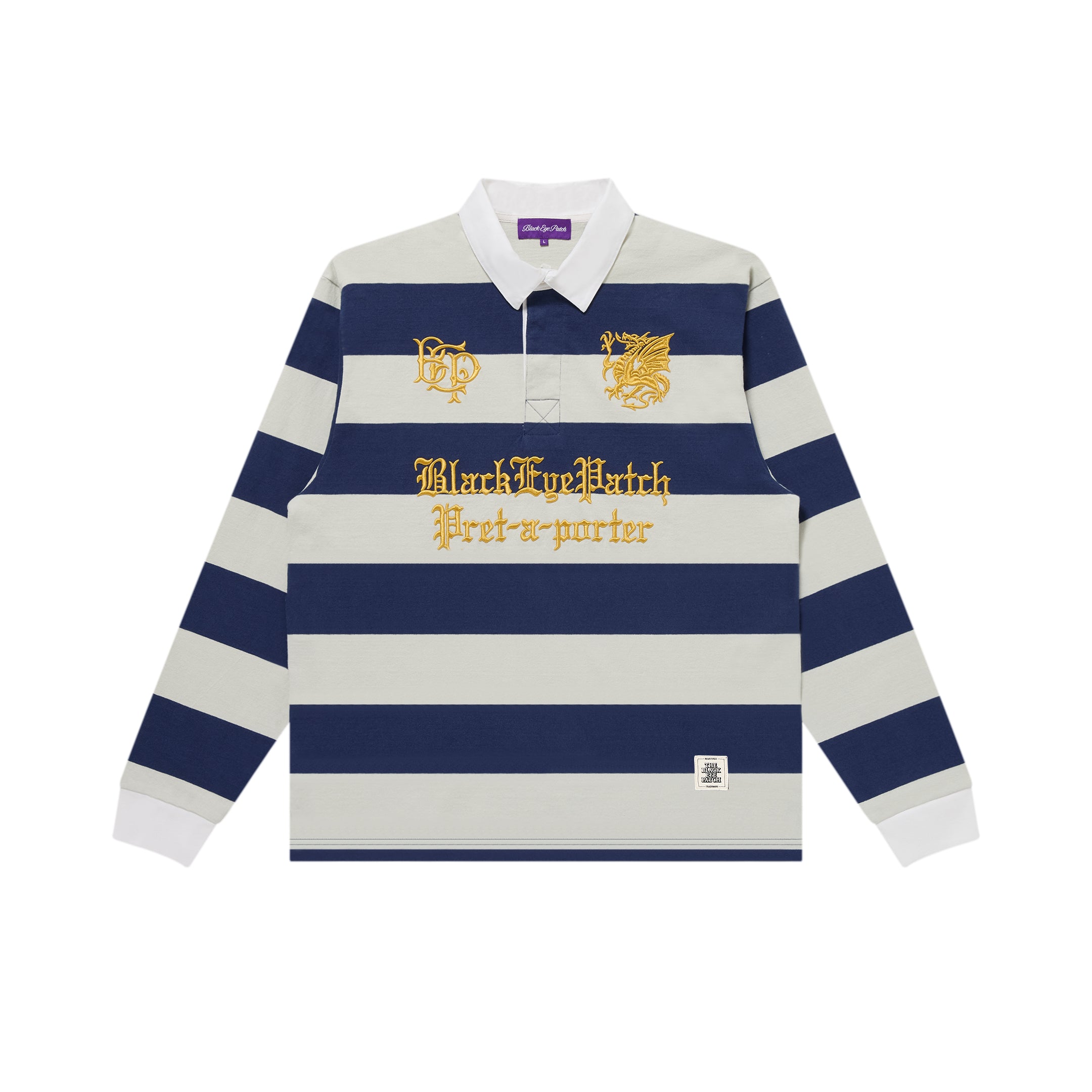 BlackEyePatch のエンブレムと、フランス語で既製服を指す言葉 "Pret-A-Porte" の刺繍が施されたラグビーシャツ。